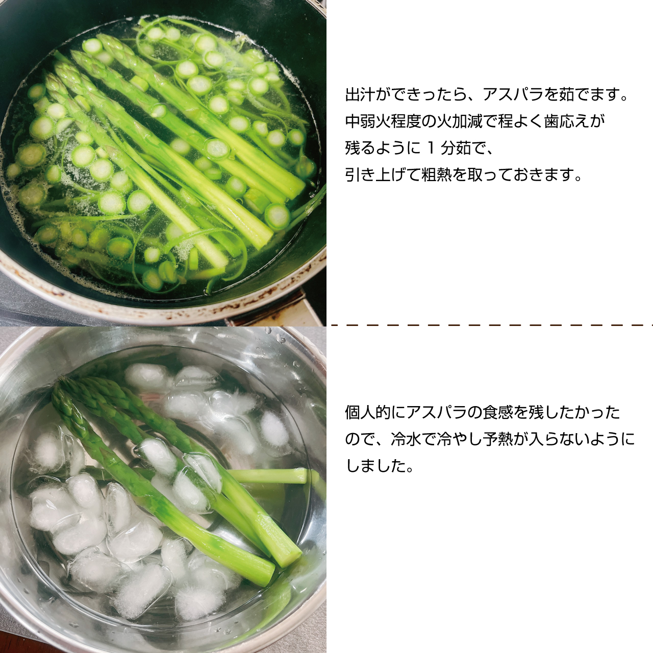 ③出汁ができったら、アスパラを茹でます。中弱火程度の火加減で程よく歯応えが残るように1分茹で、引き上げて粗熱を取っておきます。