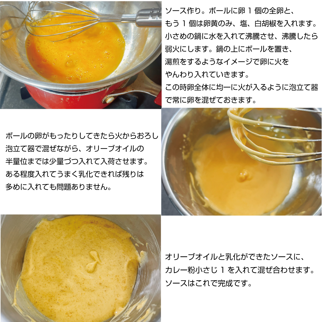 ⑥オリーブオイルと乳化ができたソースに、カレー粉小さじ1を入れて混ぜ合わせます。ソースはこれで完成です。