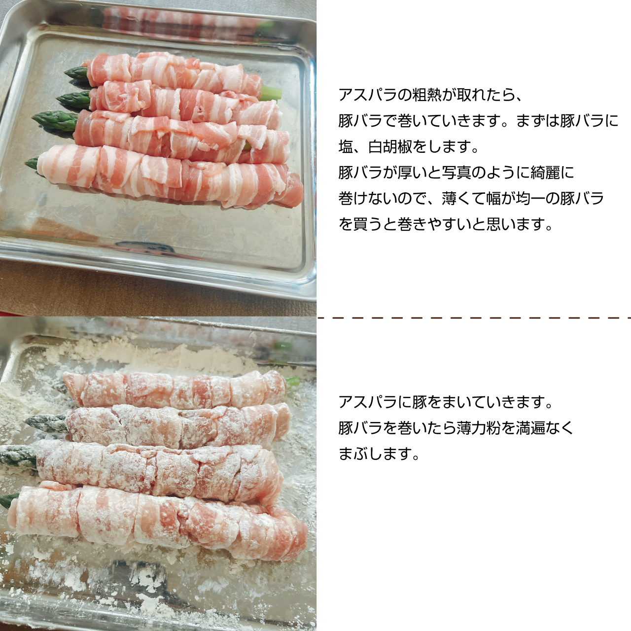 ⑦ ③のアスパラの粗熱が取れたら、豚バラで巻いていきます。まずは豚バラに塩、白胡椒をします。豚バラが厚いと写真のように綺麗に巻けないので、薄くて幅が均一の豚バラを買うと巻きやすいと思います。アスパラに豚をまいていきます。豚バラを巻いたら薄力粉を満遍なくまぶします。