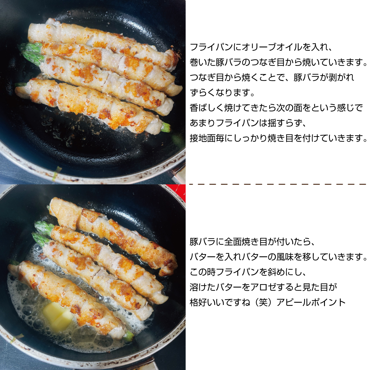 ⑧フライパンにオリーブオイルを入れ、巻いた豚バラのつなぎ目から焼いていきます。つなぎ目から焼くことで、豚バラが剥がれずらくなります。