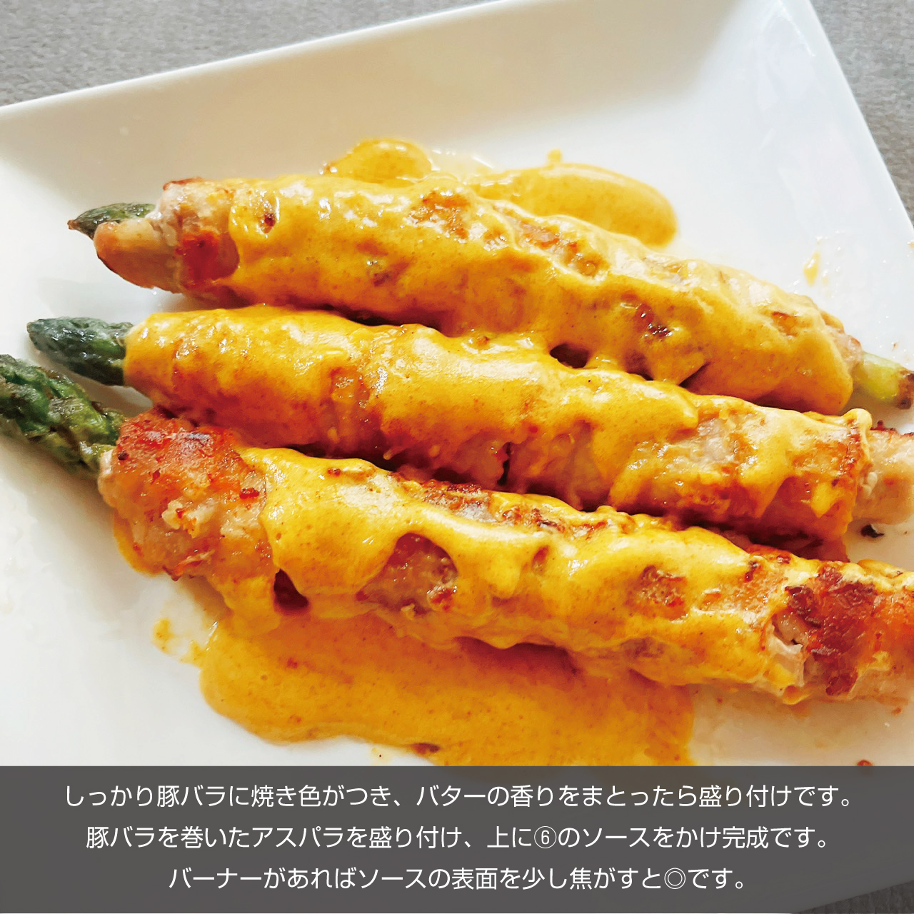 ⑩しっかり豚バラに焼き色がつき、バターの香りをまとったら盛り付けです。豚バラを巻いたアスパラを盛り付け、上に⑥のソースをかけ完成です。バーナーがあればソースの表面を少し焦がすと◎です。
