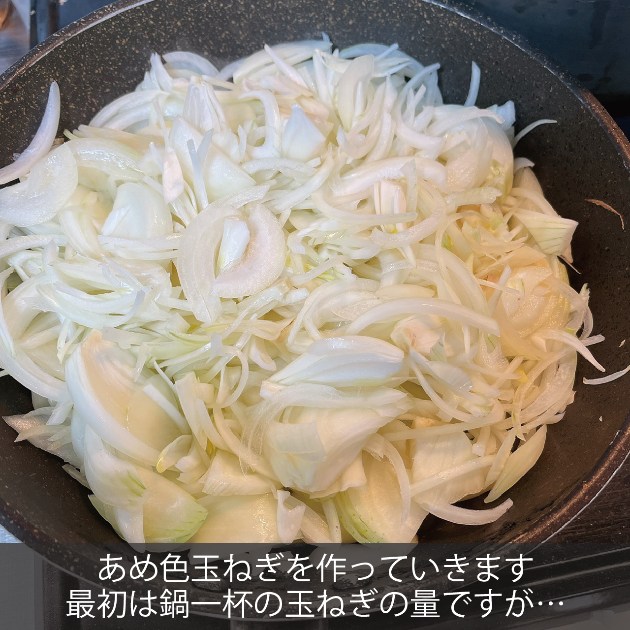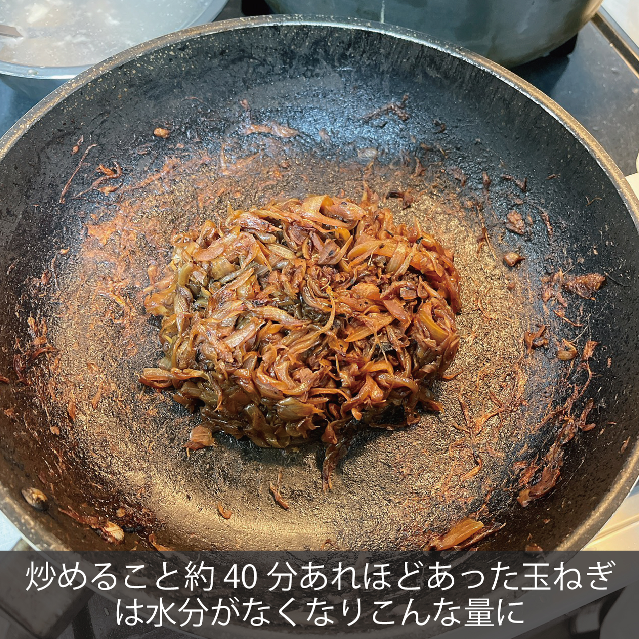 細めにスライスした玉葱をバターであめ色になるまで炒める(40分)最初は強火で焦げ目をつけるような感じで焼いていきますが、水分がなくなると焦げやすいので弱火でじっくり炒めるようにしてください。