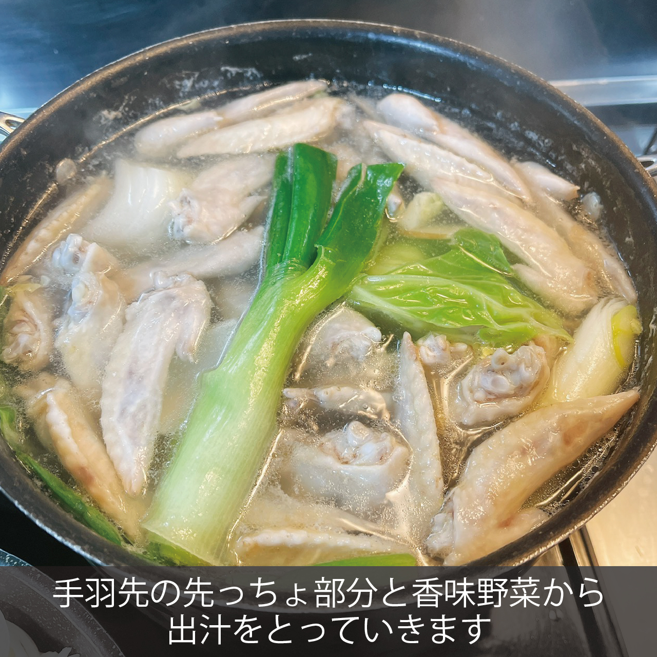 レシピの中にはスープストックの記述がないので、私は手羽先の先っちょの部分を600gと香味野菜で出汁を取りました。本当は鶏ガラが欲しかったのですが買いにいくのが面倒で近くのスーパーで売っている手羽先の先っちょの部分で代用しました。
