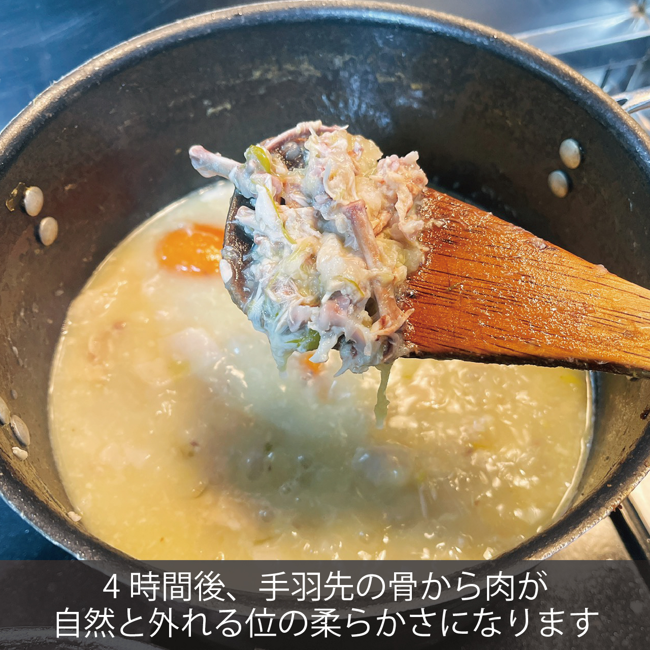 手羽先についている肉が自然にほどけてスープと一体になるまでおよそ3~4時間程度です。鶏だけだと鶏臭くなりそうだったので冷蔵庫にある野菜を適当に入れました。