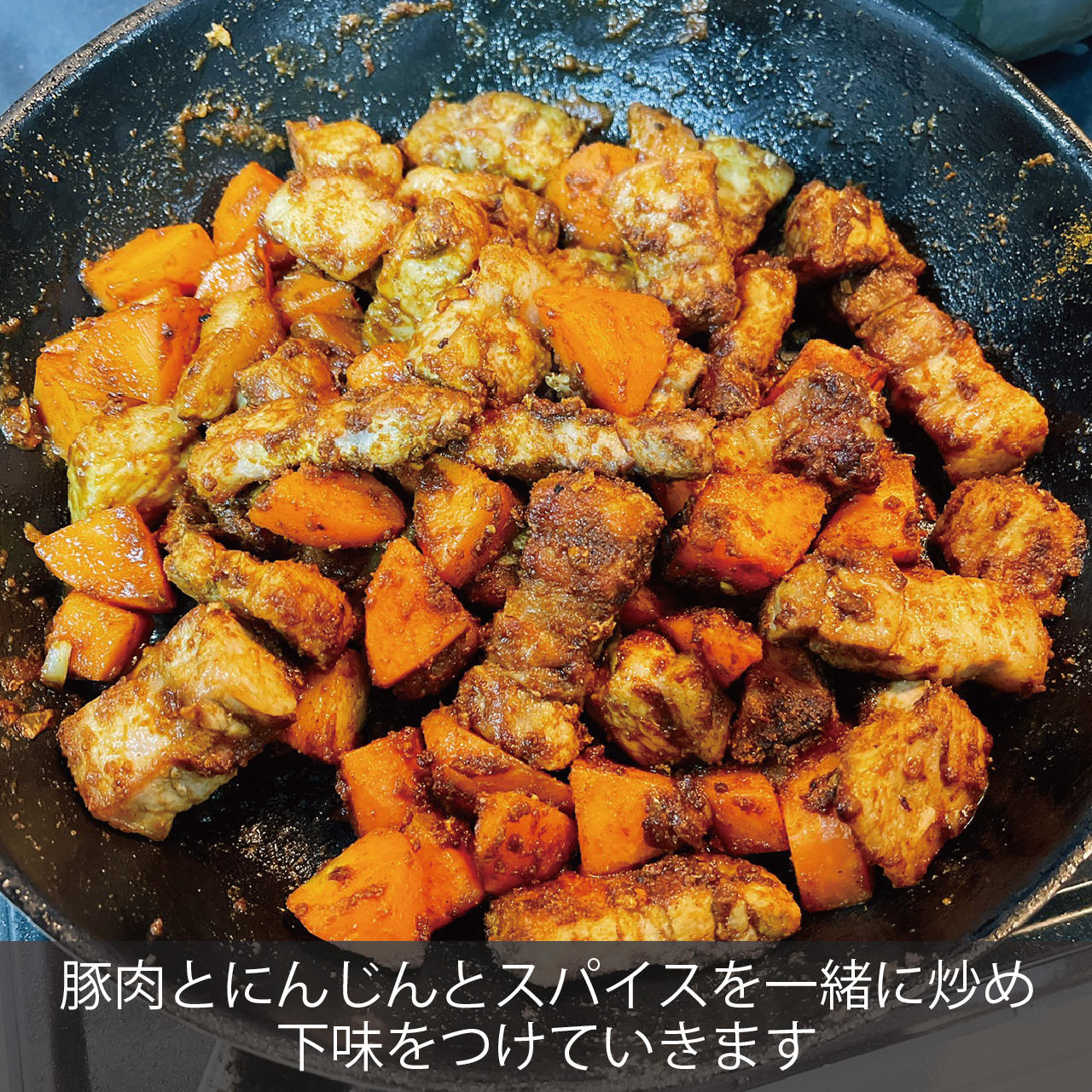 豚肉とにんじんに火が通ったらカレーパウダー、ガラムマサラ、酒の順で入れていき、豚肉と野菜に下味をつけます。