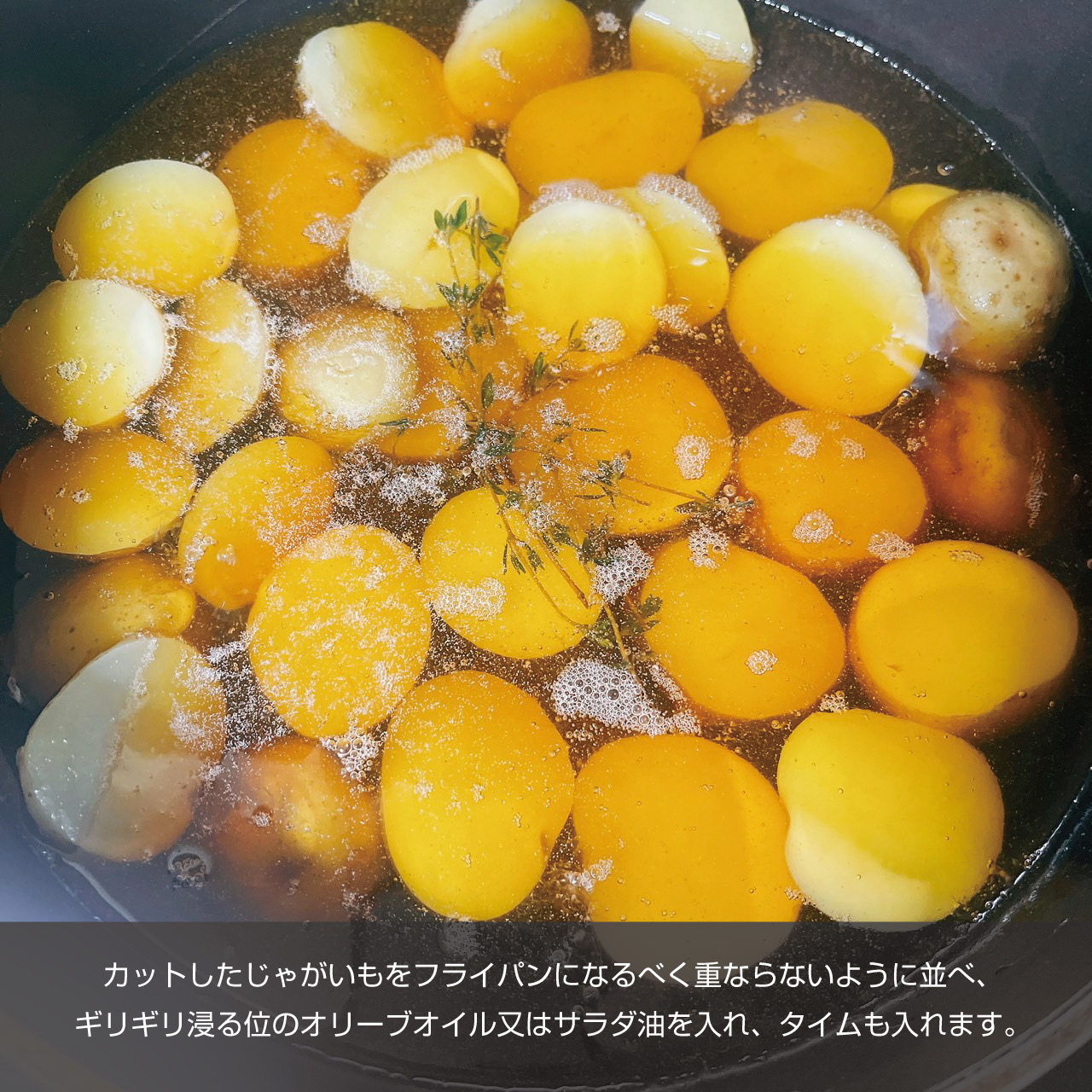 ⑤カットしたじゃがいもをフライパンになるべく重ならないように並べ、ギリギリ浸る位のオリーブオイル又はサラダ油を入れタイムも入れます。