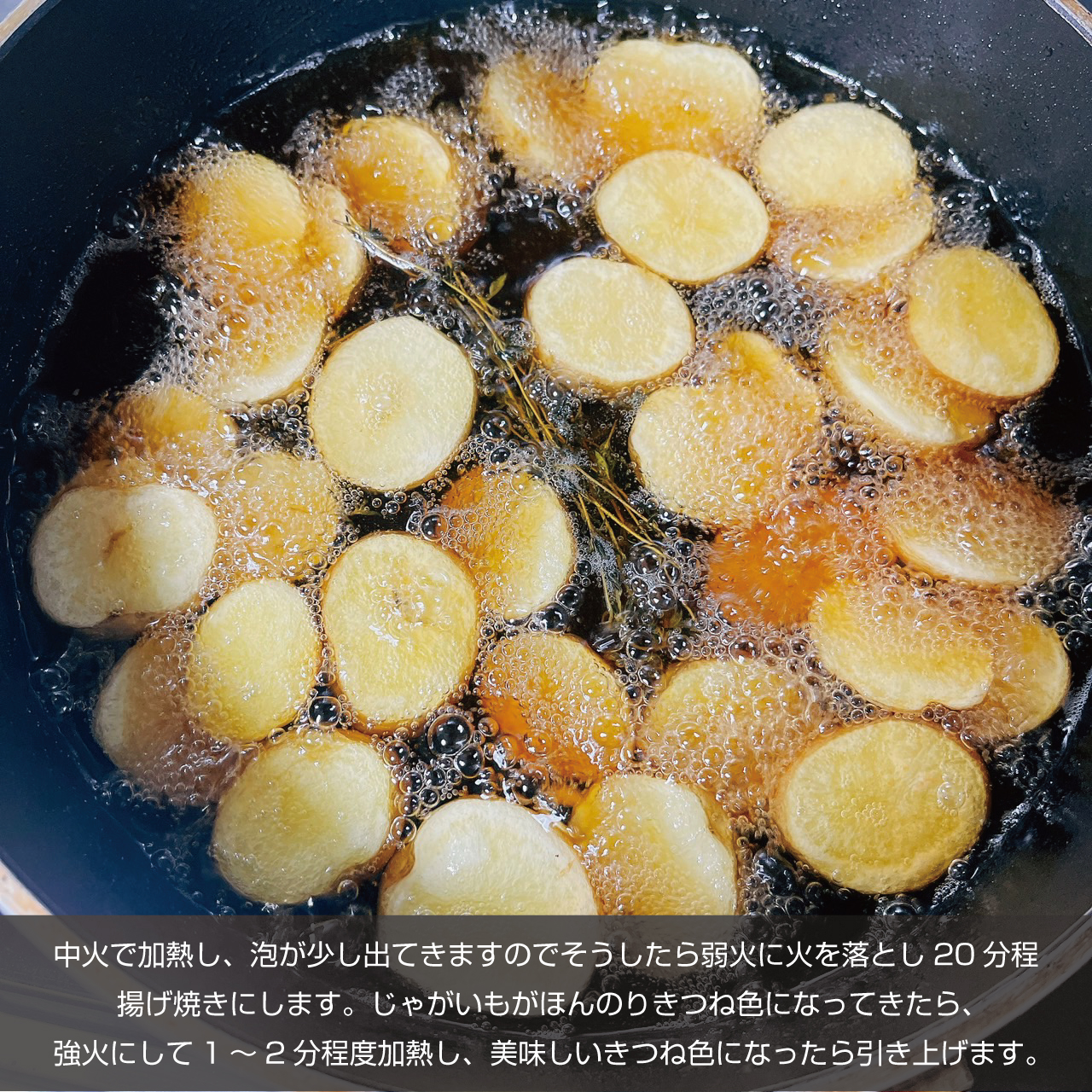 ⑥中火で加熱し、泡が少し出てきますのでそうしたら弱火に火を落とし20分程揚げます。