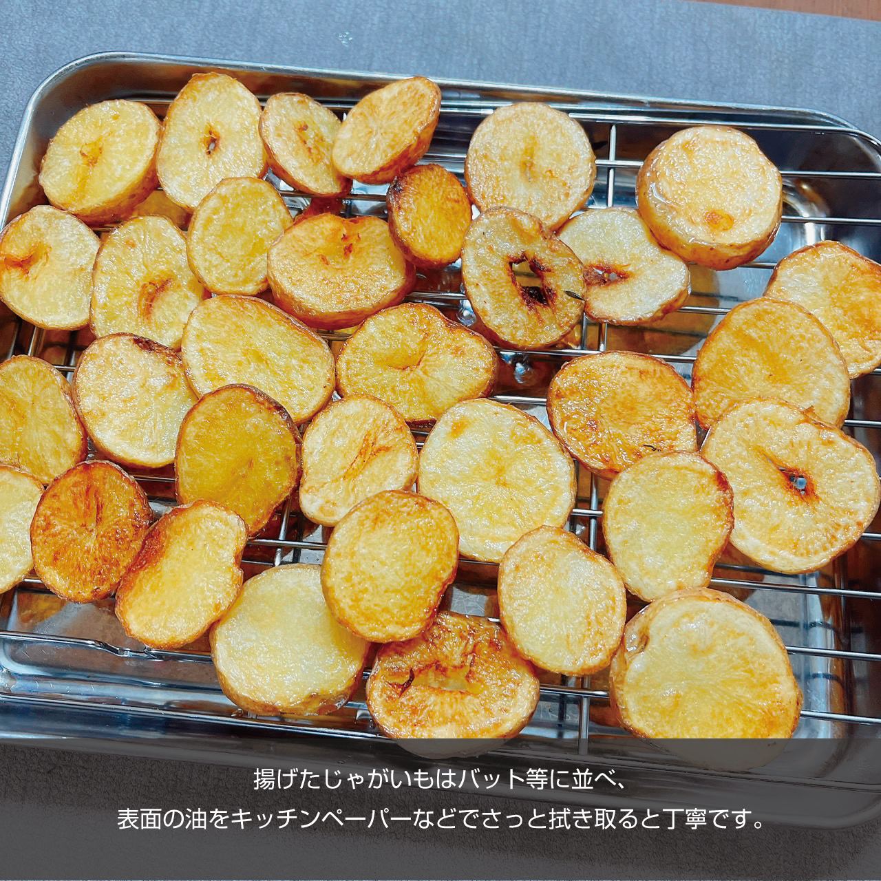 ⑦揚げたじゃがいもをバット等に並べ、表面の油をキッチンペーパーなどでさっと拭き取ります。