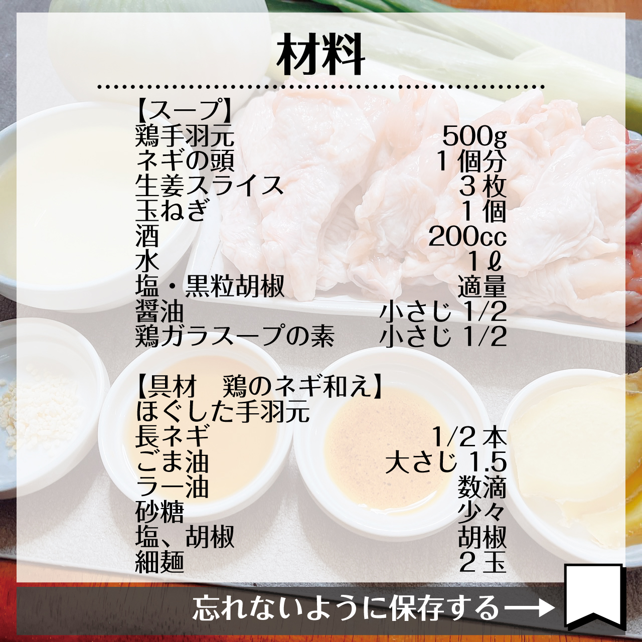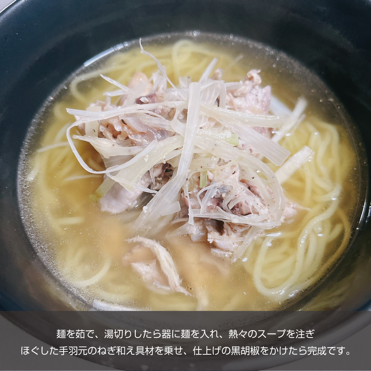 鶏ガラを使わず、鶏の手羽元で代用しスープを取った手羽元をほぐして白髪ねぎと和え具材にするというこのムダのないレシピがめちゃくちゃ考えられているなと感じました。