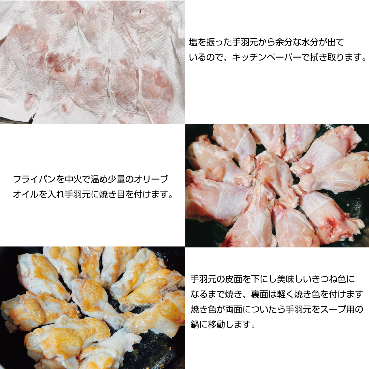③塩を振った手羽元から余分な水分が出ているので、キッチンペーパーで拭き取ります。フライパンを中火で温め少量のオリーブオイルを入れ手羽元に焼き目を付けます。