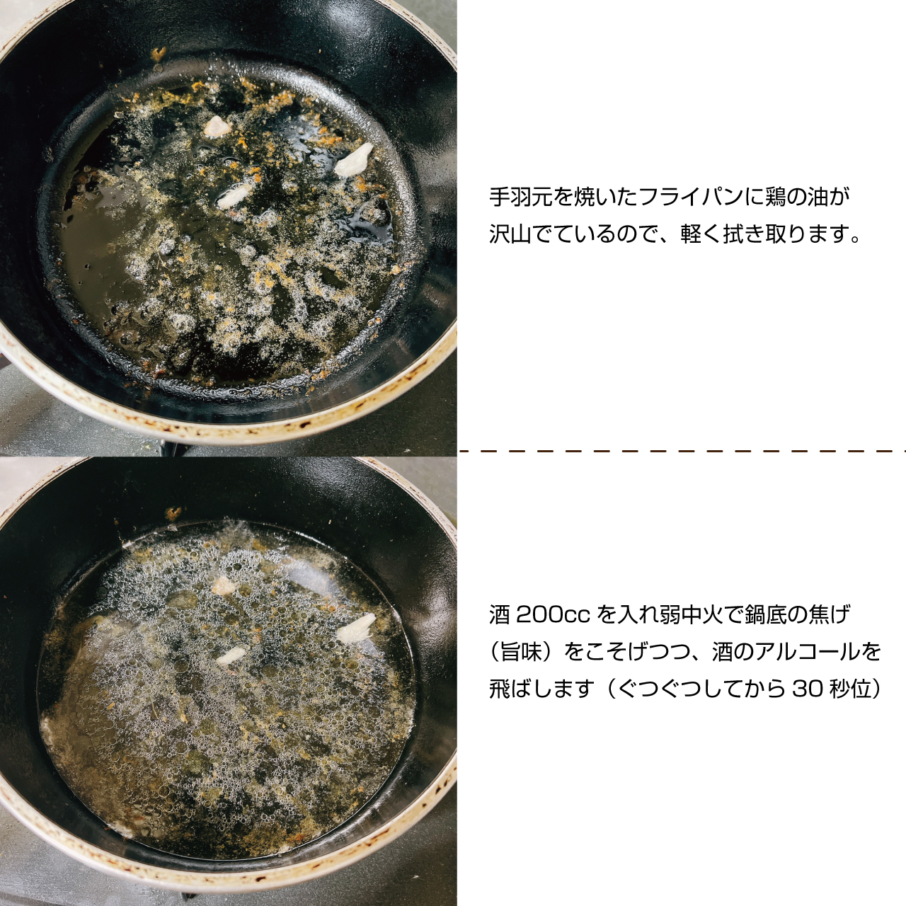 ④手羽元を焼いたフライパンに鶏の油が沢山でているので、軽く拭き取り酒200ccを入れ弱中火で鍋底の焦げ(旨味)をこそげつつ、酒のアルコールを飛ばします(ぐつぐつしてから30秒位)