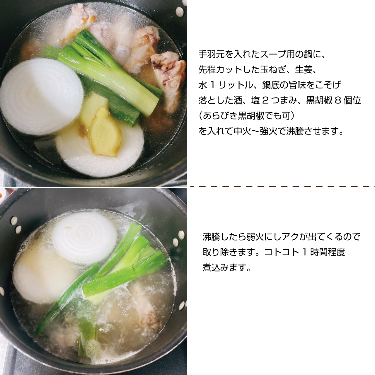 ⑤手羽元を入れたスープ用の鍋に、先程カットした玉ねぎ、生姜、水1リットル、鍋底の旨味をこそげ落とした酒、塩2つまみ、黒胡椒8個位(あらびき黒胡椒でも可)を入れて中火~強火で沸騰させます。