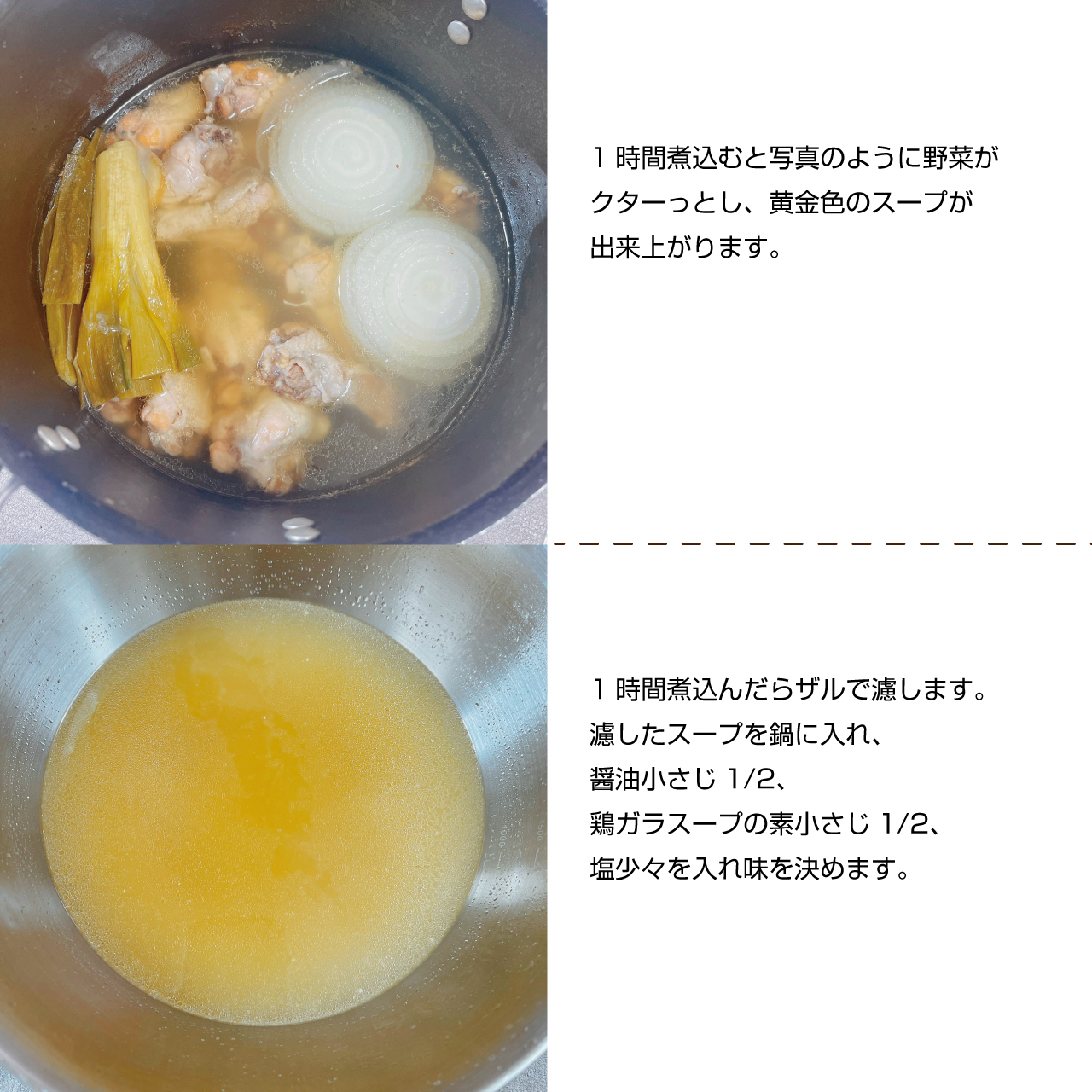 ⑧濾したスープを鍋に入れ、醤油小さじ1/2、鶏ガラスープの素小さじ1/2、塩少々を入れ味を決めます。