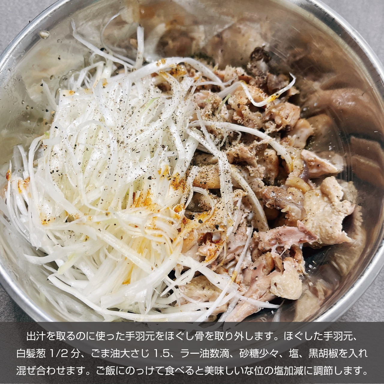 ⑦トッピング具材作り 出汁を取るのに使った手羽元をほぐし骨を取り外します。ほぐした手羽元、白髪葱1/2分、ごま油大さじ1.5、ラー油数滴、砂糖少々、塩、黒胡椒を入れ混ぜ合わせます。ご飯にのっけて食べると美味しいな位の塩加減に調節します。