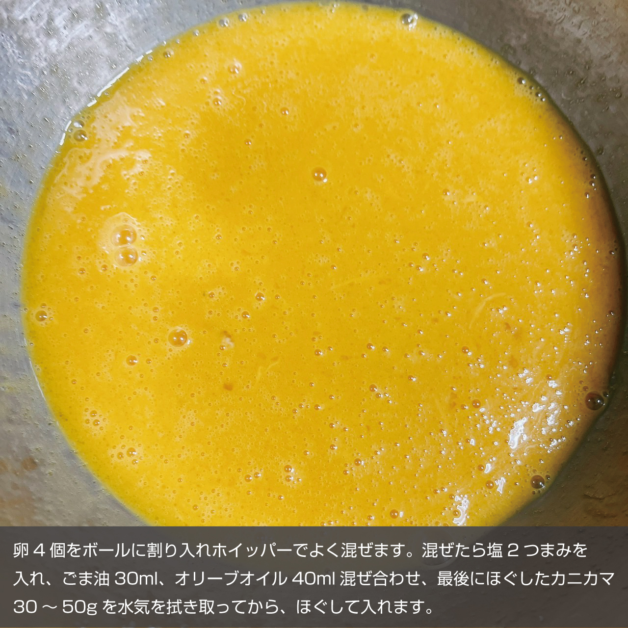 ②卵4個をボールに割り入れ卵をホイッパーでよく混ぜます。混ぜたら塩2つまみを入れ混ぜ、ごま油30mlを入れ混ぜ、オリーブオイル40mlを入れ混ぜ、最後にほぐしたカニカマ30~50gを水気を拭き取ってから、ほぐして入れて全体を混ぜ合わせます。