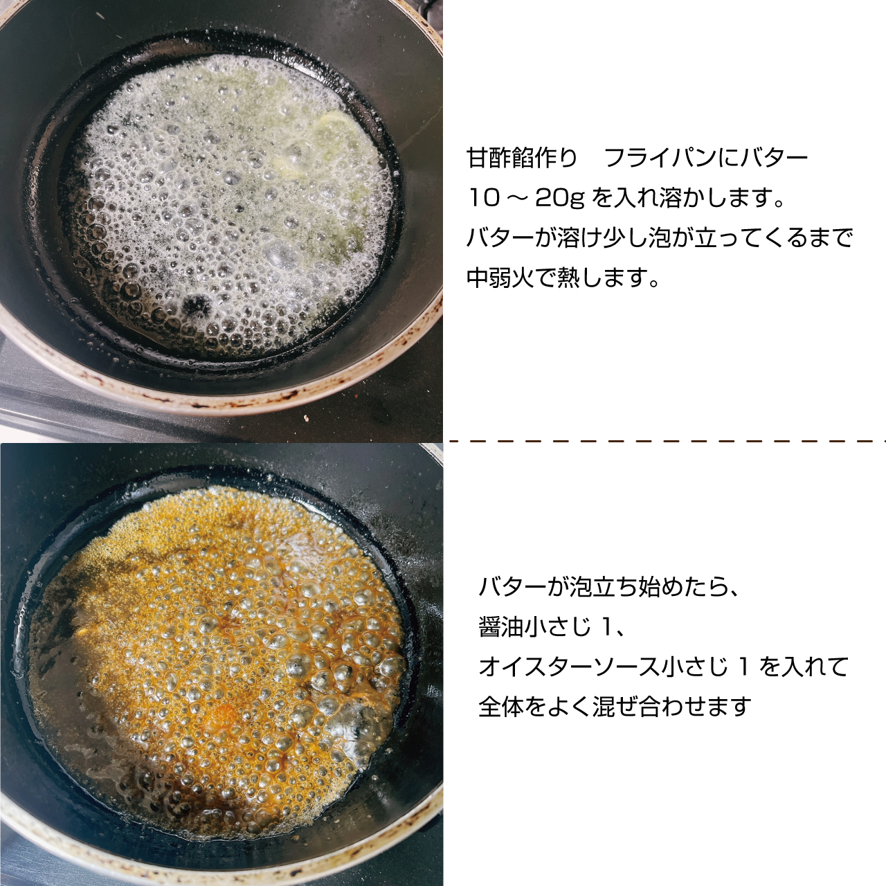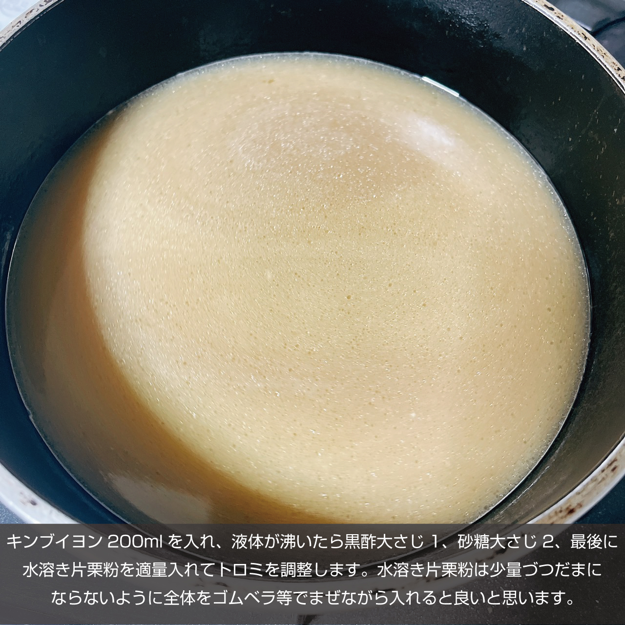 ③甘酢餡作り フライパンにバター10~20gを入れ溶かします。バターが溶け少し泡が立ってきたら、醤油小さじ1、オイスターソース小さじ1、キンブイヨン200mlを入れ、液体が沸いたら黒酢大さじ1、砂糖大さじ2、最後に水溶き片栗粉を適量入れてトロミを調整して甘酢餡の完成です。水溶き片栗粉は少量づつだまにならないように全体をゴムベラ等でまぜながら入れると良いと思います。