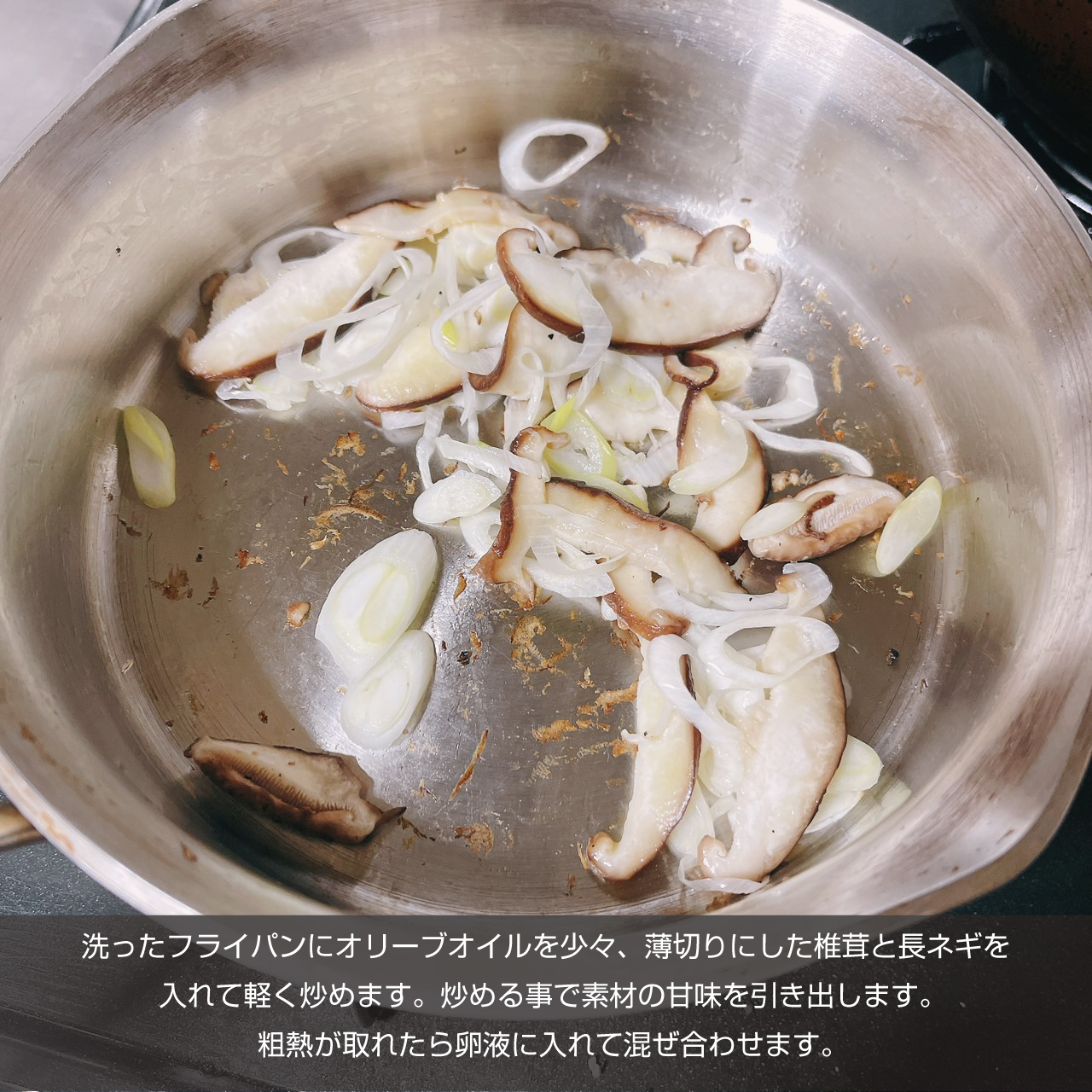 ④洗ったフライパンにオリーブオイルを少々、薄切りにした椎茸と長ネギを入れて軽く炒めます。炒める事で素材の甘味を引き出します。粗熱が取れたら②の卵液に入れます。
