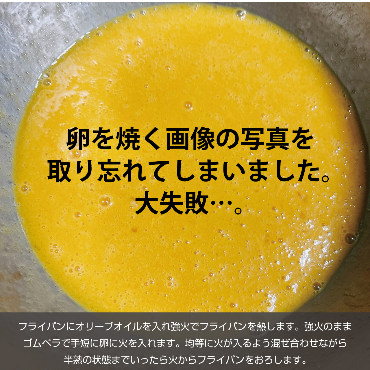 ⑤フライパンにオリーブオイルを入れ強火でフライパンを熱します。④の卵液をフライパンに入れ強火のままゴムベラで手短に卵に火を入れます。フライパンの卵液を均等に混ぜ合わせながら半熟の状態まで行ったら火からフライパンをおろします。