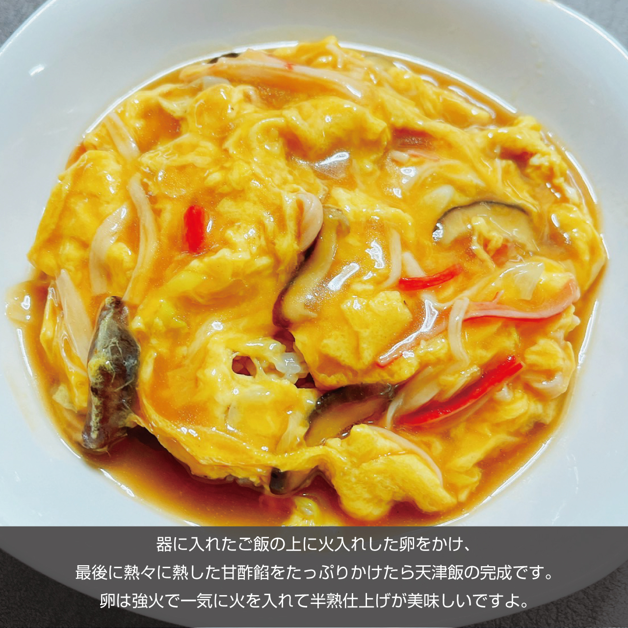 ⑥ 器に入れたご飯の上に火入れした卵をかけ、最後に熱々に熱した甘酢餡をたっぷりかけたら天津飯の完成です。