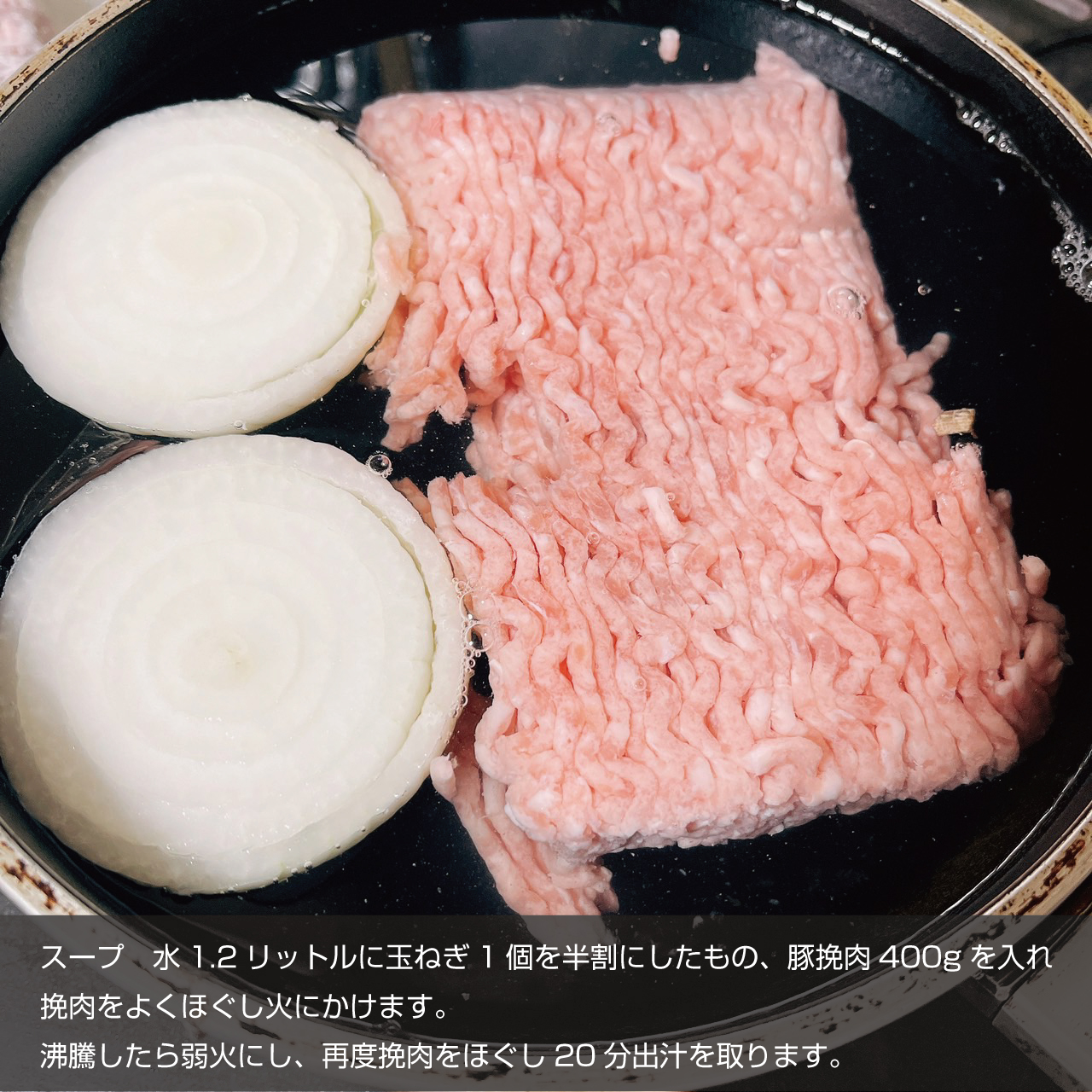 ①スープ 水1.2リットルに玉ねぎ1個を半割にしたもの、豚挽肉400gを入れ挽肉をよくほぐし火にかけます。沸騰したら弱火にし再度挽肉をほぐし20分出汁を取ります。