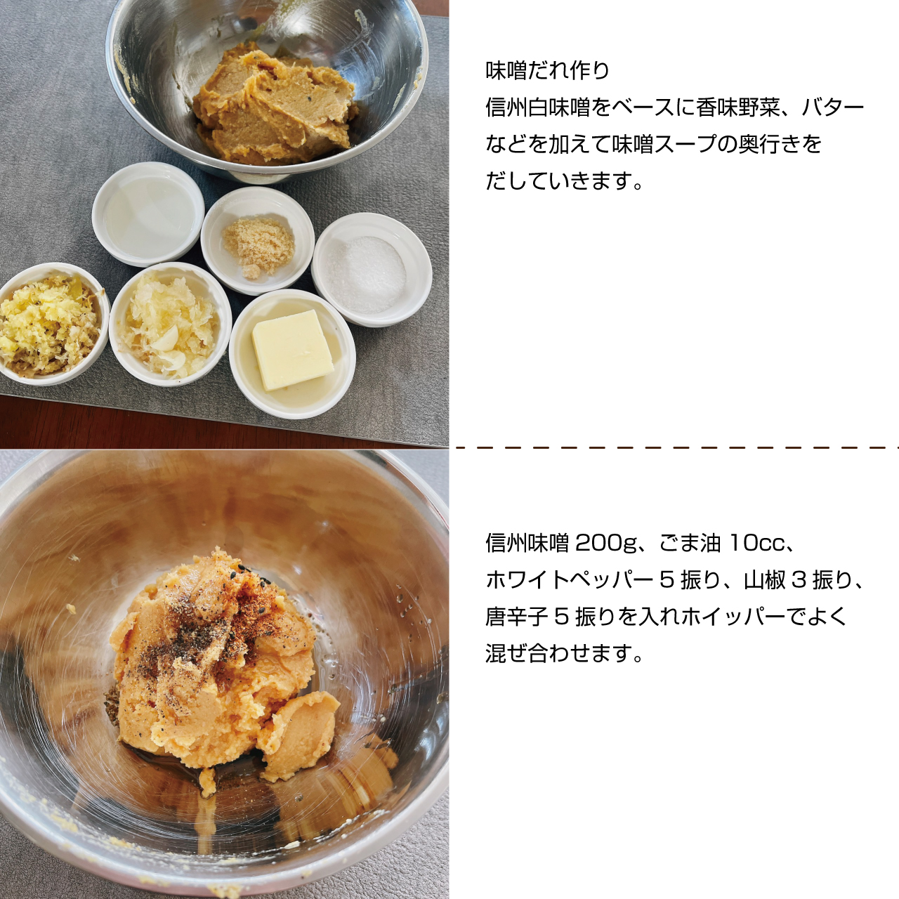 ②味噌だれ 信州味噌200g、ごま油10cc、ホワイトペッパー5振り、山椒3振り、唐辛子5振りを入れホイッパーでよく混ぜ合わせます。