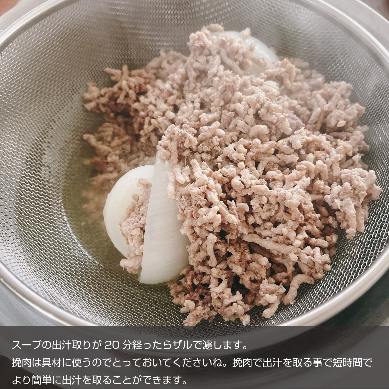 ⑤ ①のスープが20分経ったらザルで濾します。挽肉は具材に使うのでとっておいてください。