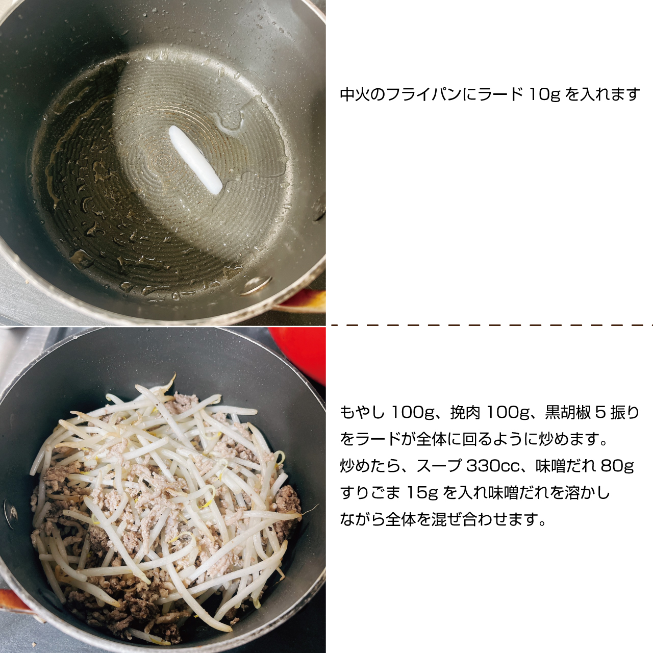 ⑥【1人前の具材とスープの量です】中火のフライパンにラード10gを入れ、もやし100g、挽肉100g、黒胡椒5振りをラードが全体に回るように炒めます。炒めたら、スープ330cc、味噌だれ80g、すりごま15gを入れ味噌だれを溶かしながら全体を混ぜ合わせます。
