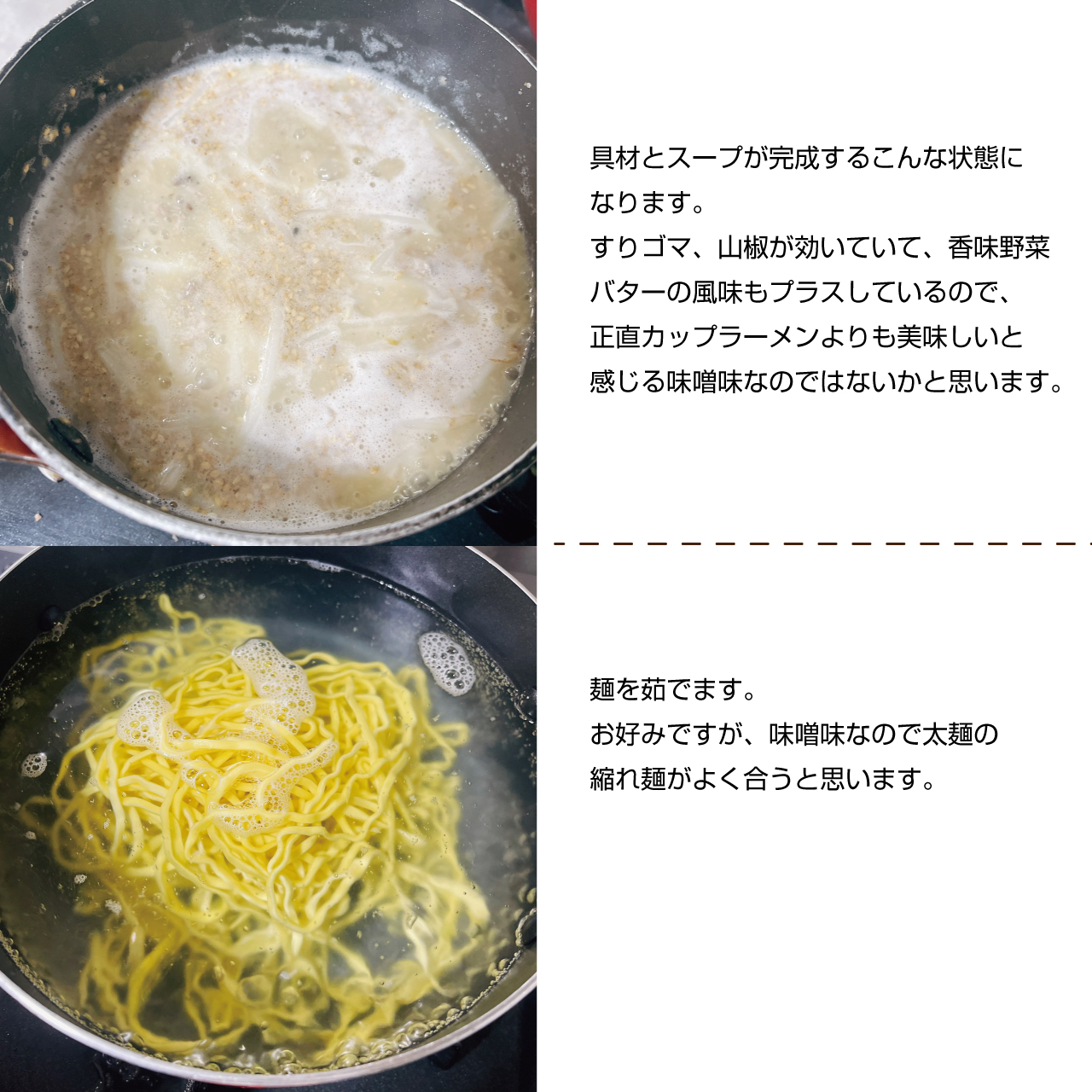 味のベースは味噌です。そこに山椒、すりごま、香味野菜、バターの風味が加わりもはやカップラーメンの味ではない事は間違いありません(笑)