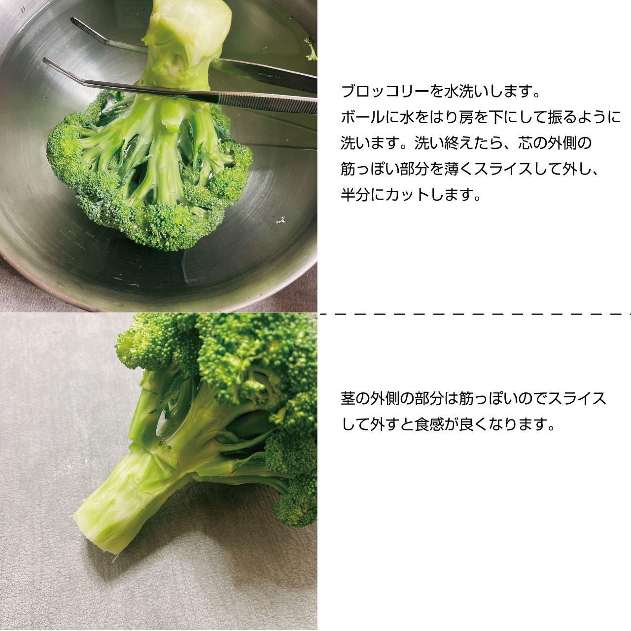 ①ブロッコリーを水洗いします。ボールに水をはり房を下にして振るように洗います。洗い終えたら、芯の外側の筋っぽい部分を薄くスライスして外し、半分にカットします。