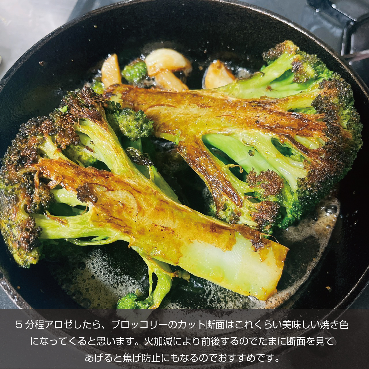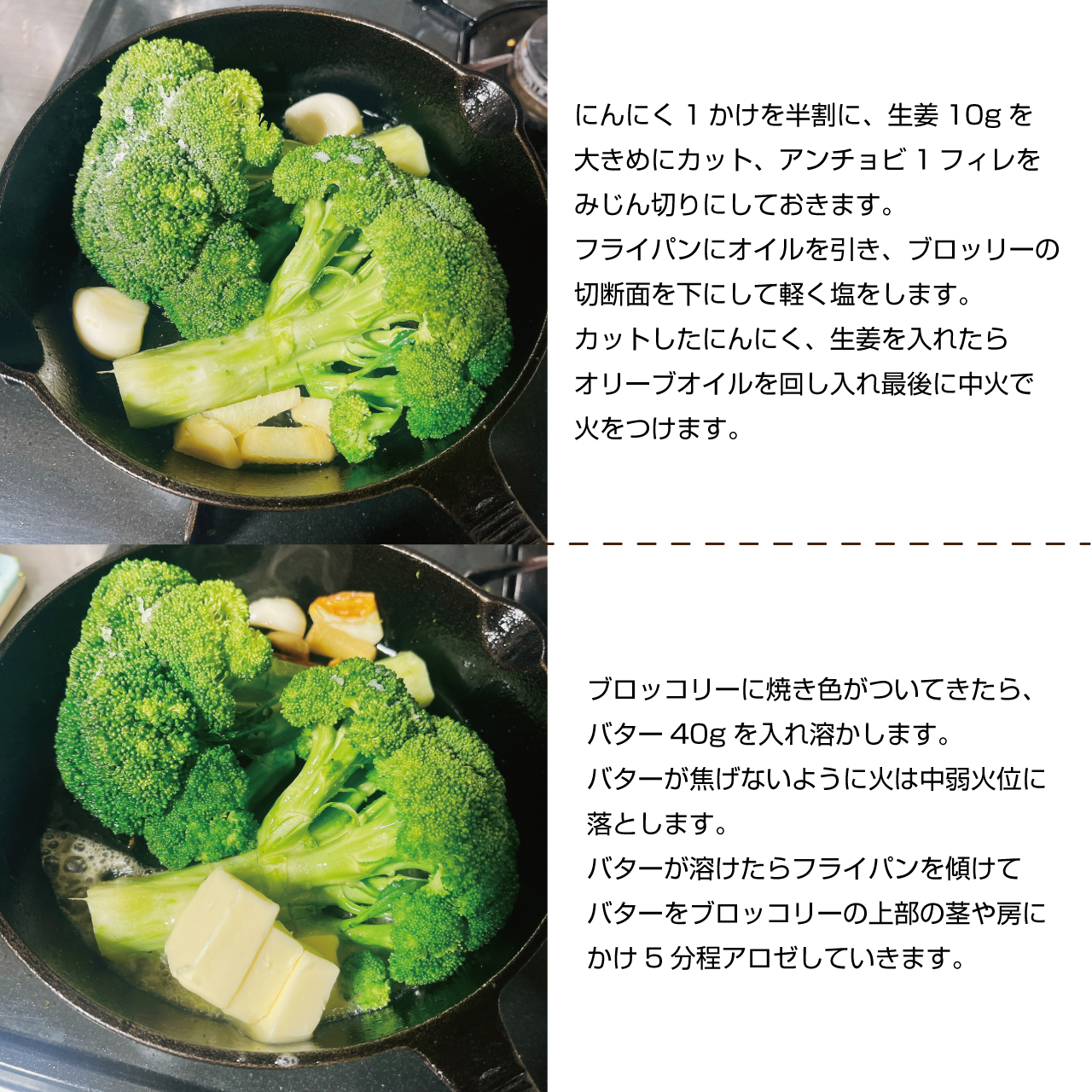 ブロッコリーを半割にカットして切断面をしっかり焼き目を入れますが、多めのバターを入れてアロゼする事でブロッコリー上部の房の部分や中央の茎の部分にも程よく火入れします。