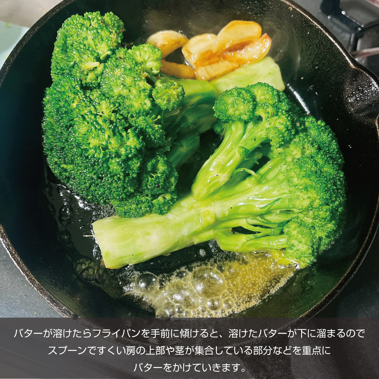 ④ブロッコリーに焼き色がついてきたら、バター40gを入れ溶かします。バターが焦げないように火は中弱火位に落とします。バターが溶けたらフライパンを傾けてバターをブロッコリーの上部の茎や房にかけ5分程アロゼしていきます。