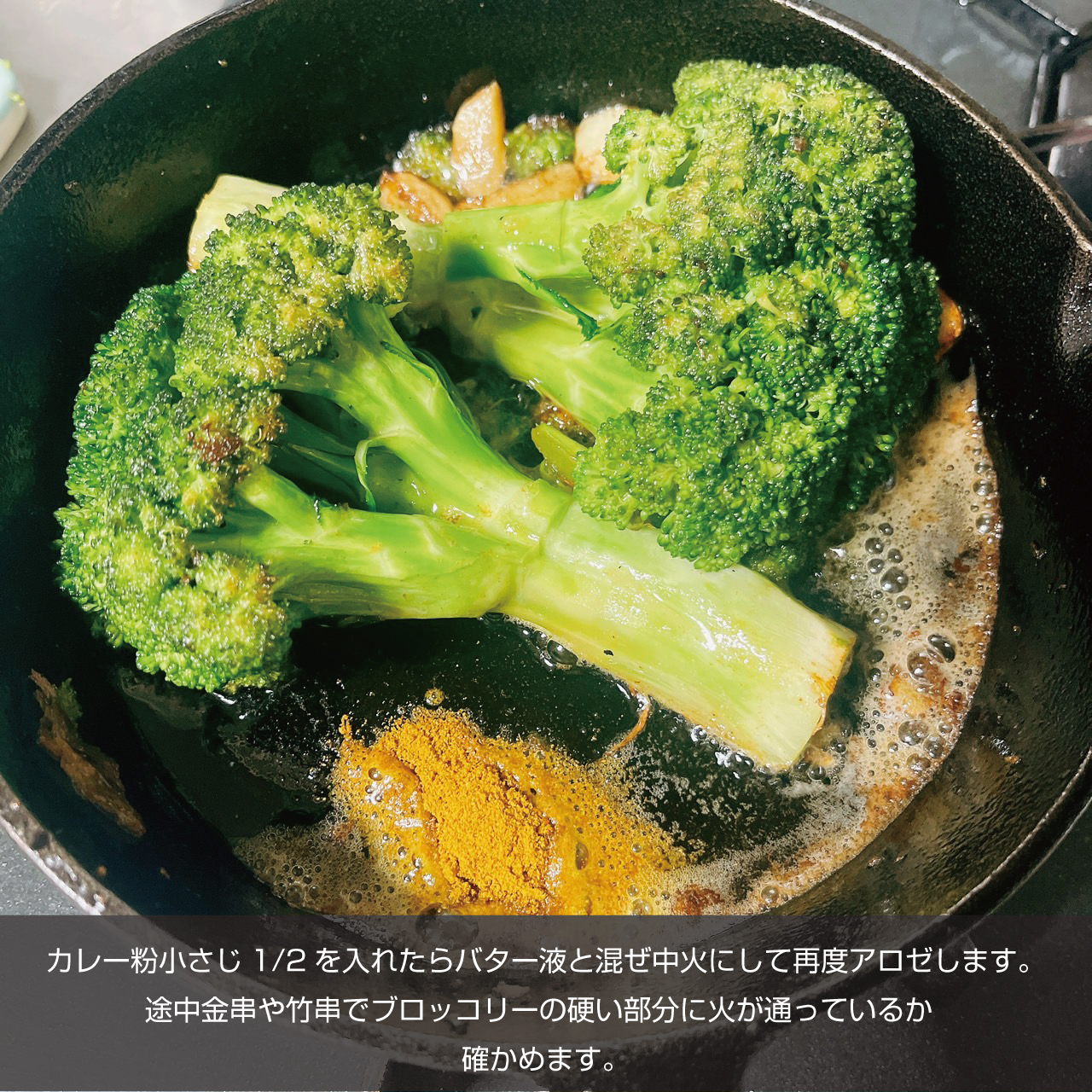 ⑤カレー粉小さじ1/2を入れたら中火にして再度アロゼします。途中金串や竹串でブロッコリーの硬い部分に火が通っているか確かめます。