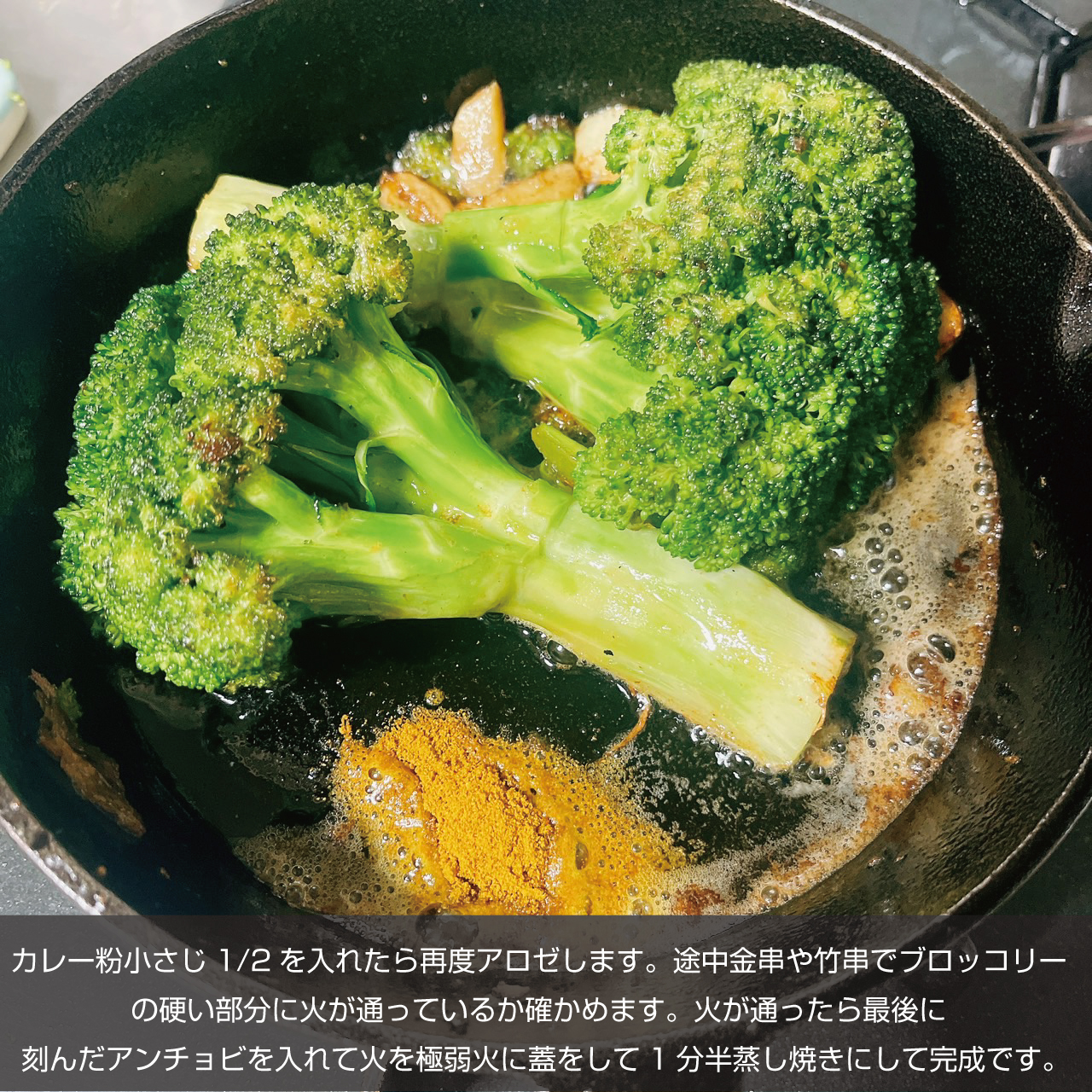 にんにく、生姜、アンチョビ、ブロッコリー、バター、カレー粉とメインの食材や調味料は少ないながらも絶品の仕上がりになります。