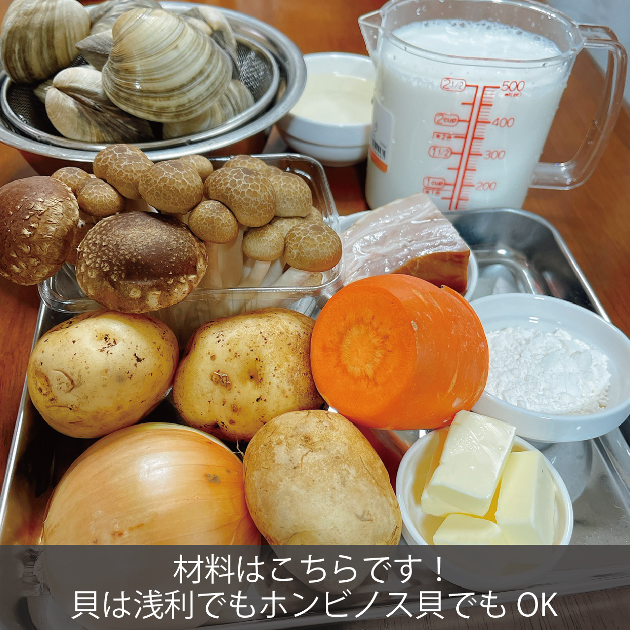 クラムチャウダーには浅利も美味しいですが、安価のホンビノス貝をたくさん入れると貝出汁がたくさん出てがおすすめです