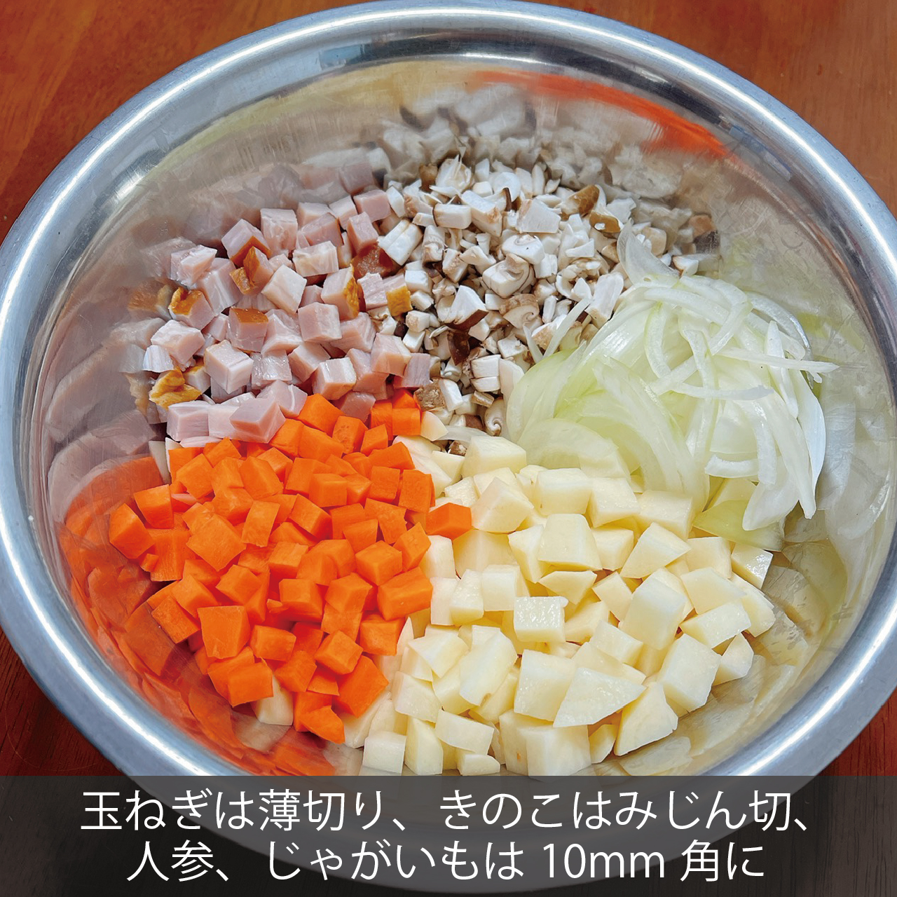 ❷玉ねぎは薄切り、じゃがいも、にんじん、ベーコン、は10mm程度の角切り、きのこはみじん切りにします。