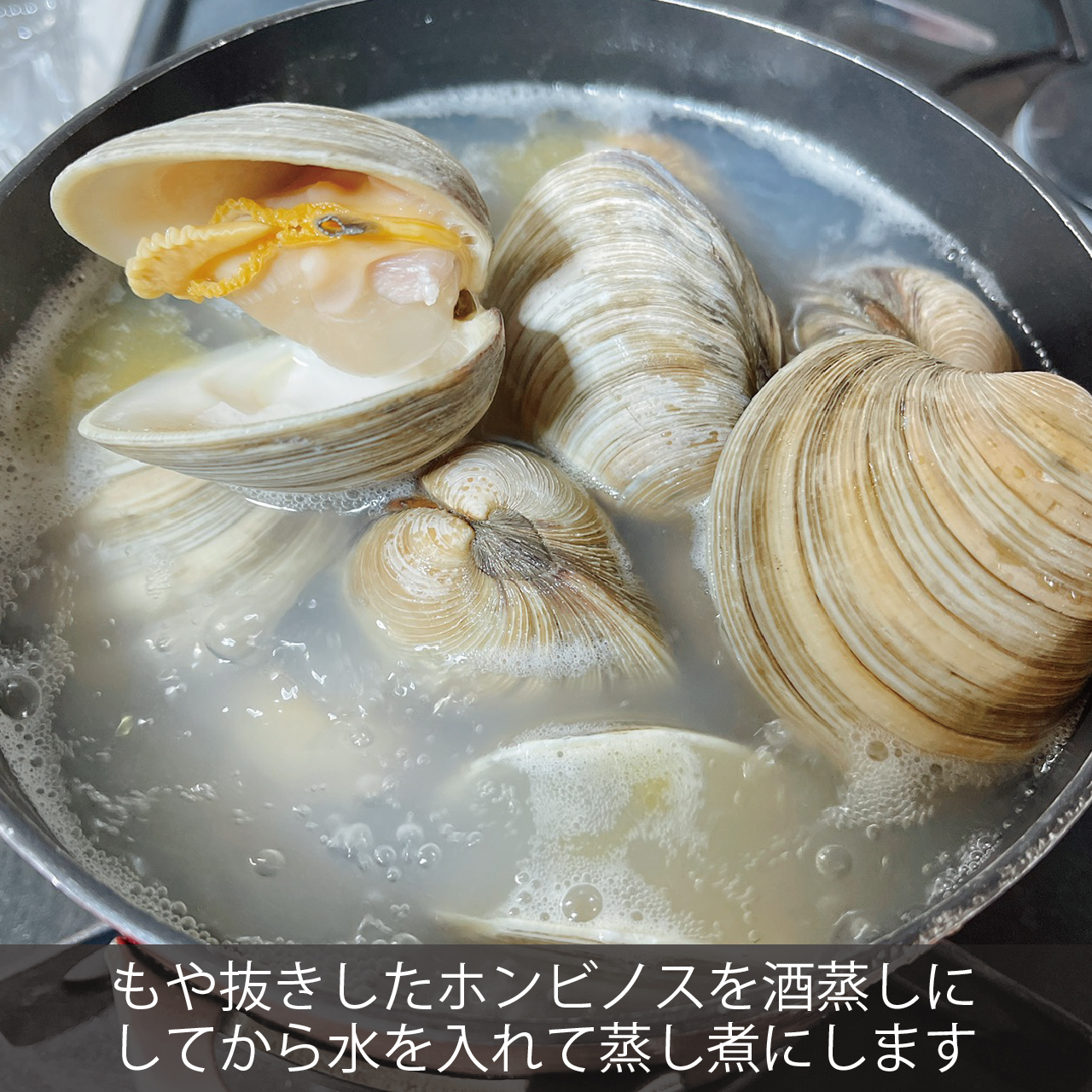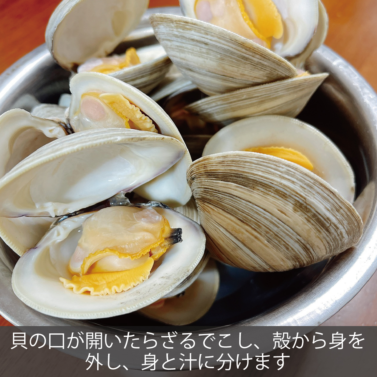 ホンビノス貝を使う場合は最後の味の調整の時に塩加減は注意してください。塩抜き具合によっては最後の塩がいらない場合もあります。