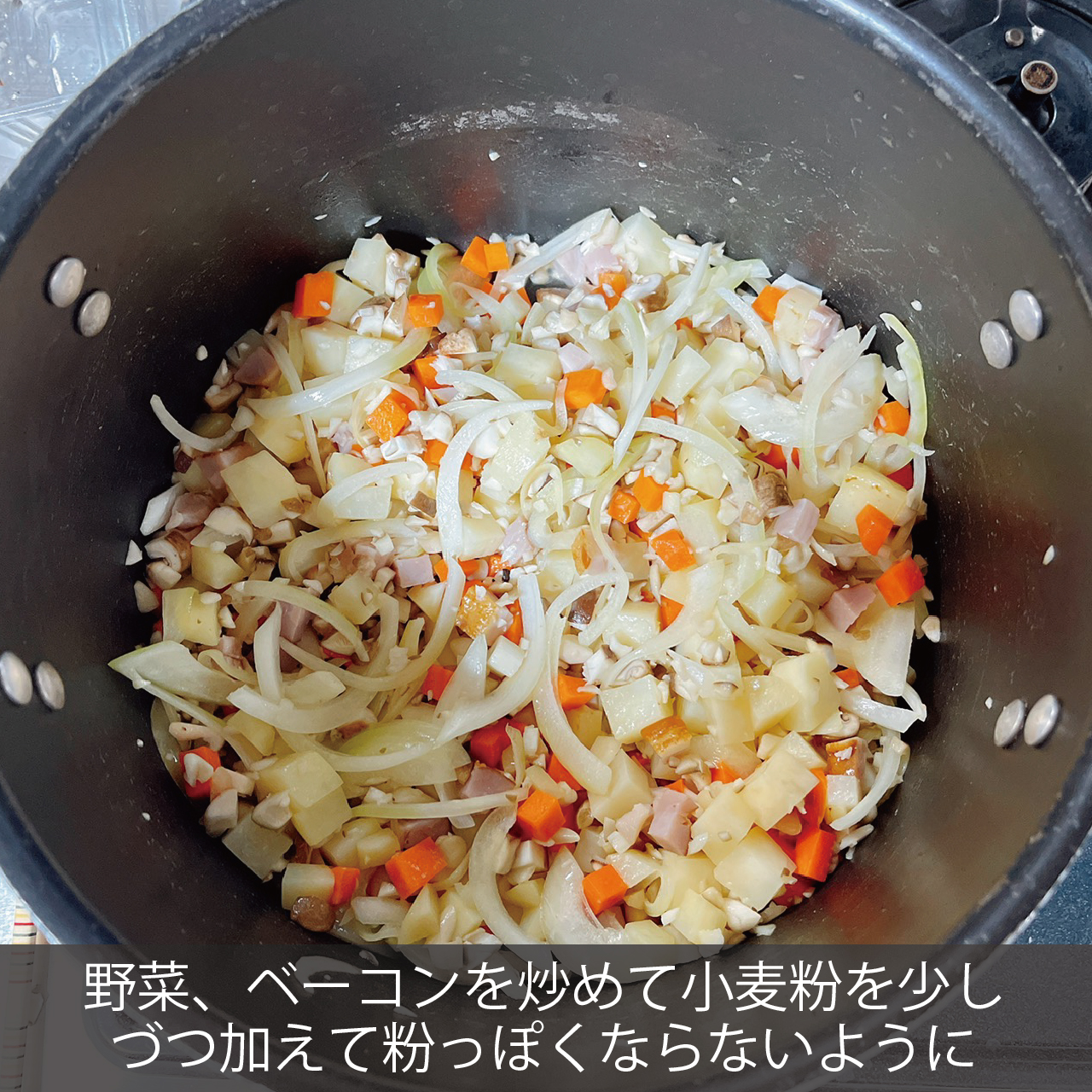 ❹鍋に残りのバターを入れて、にんじん、じゃがいも、たまねぎ、きのこ、ベーコンを加えて焦げないように中火~弱火の間くらいで炒めます。炒める際は木べらなどで野菜が崩れないようにやさしく炒めてください。しっかり炒めたら小麦粉が玉にならないように少量づつ加えて炒めます。小麦粉が入れ終わったら貝だしのスープを加えてひと煮立ちさせアクを取ります。