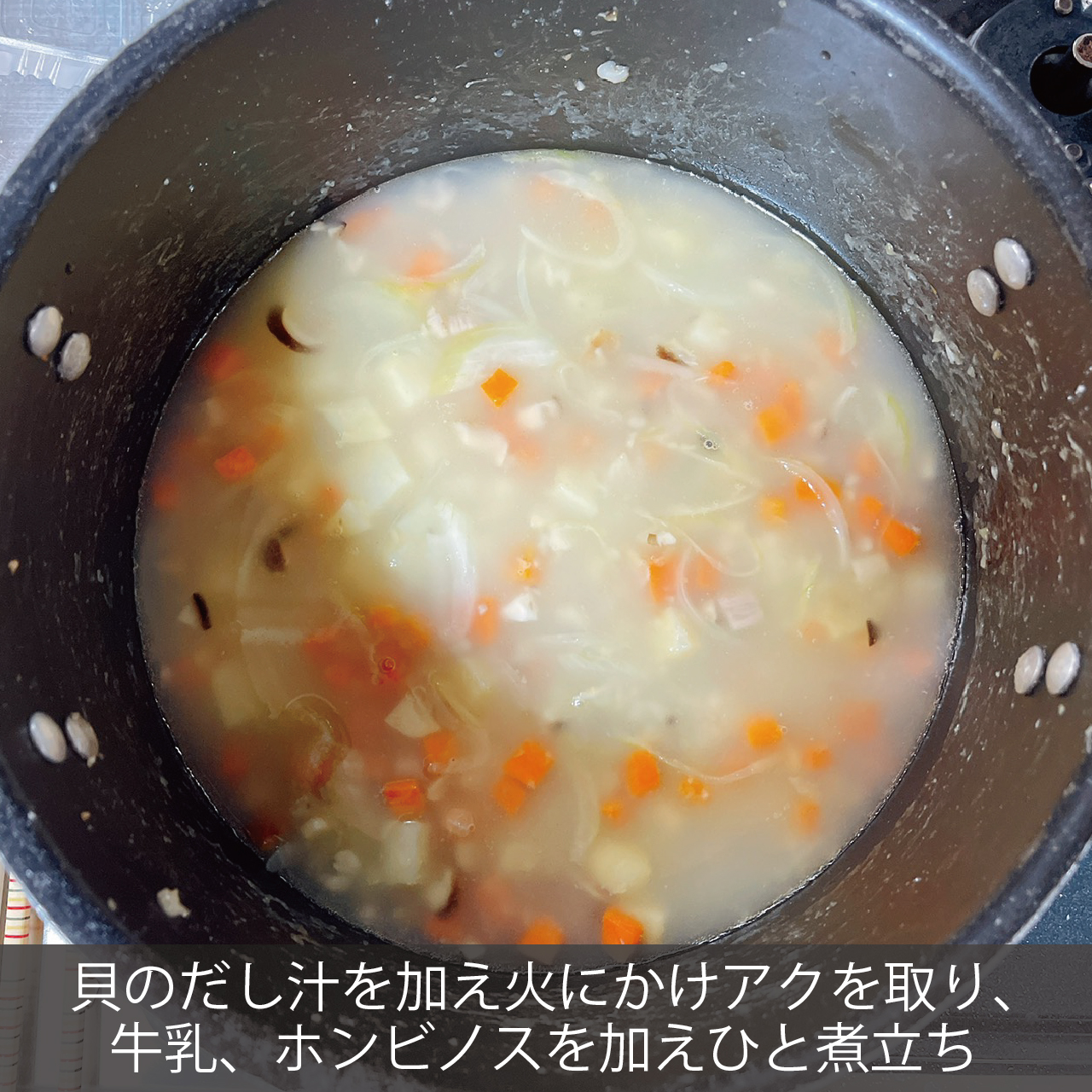 ❺牛乳と貝を加えひと煮立ちさせ、味をみて塩・コショウをします。貝の塩分があるので味を見てから塩を足すと失敗しません。