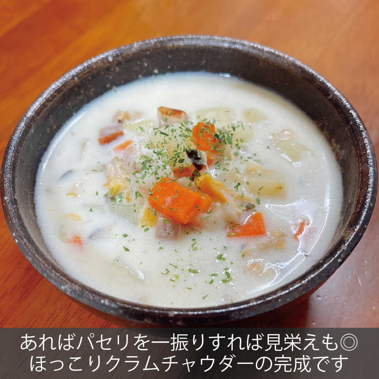 お店で食べるよりも野菜と貝を沢山使ったクラムチャウダーは別格の美味しさなので、ぜひぜひ家で作る事をオススメします。