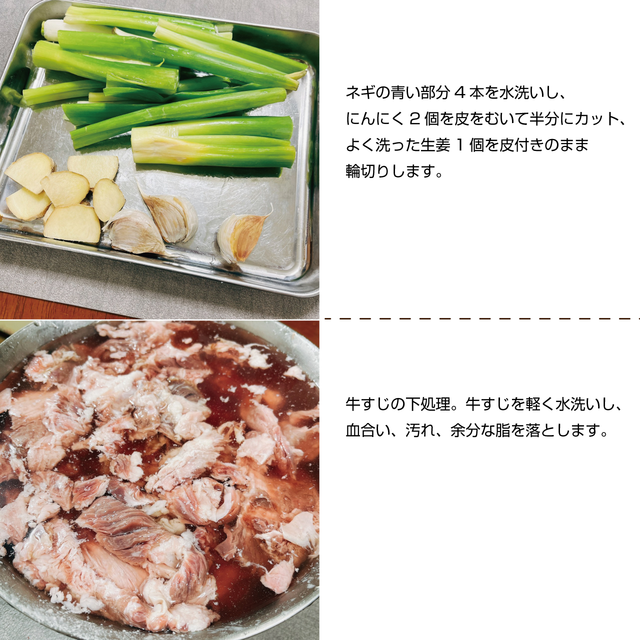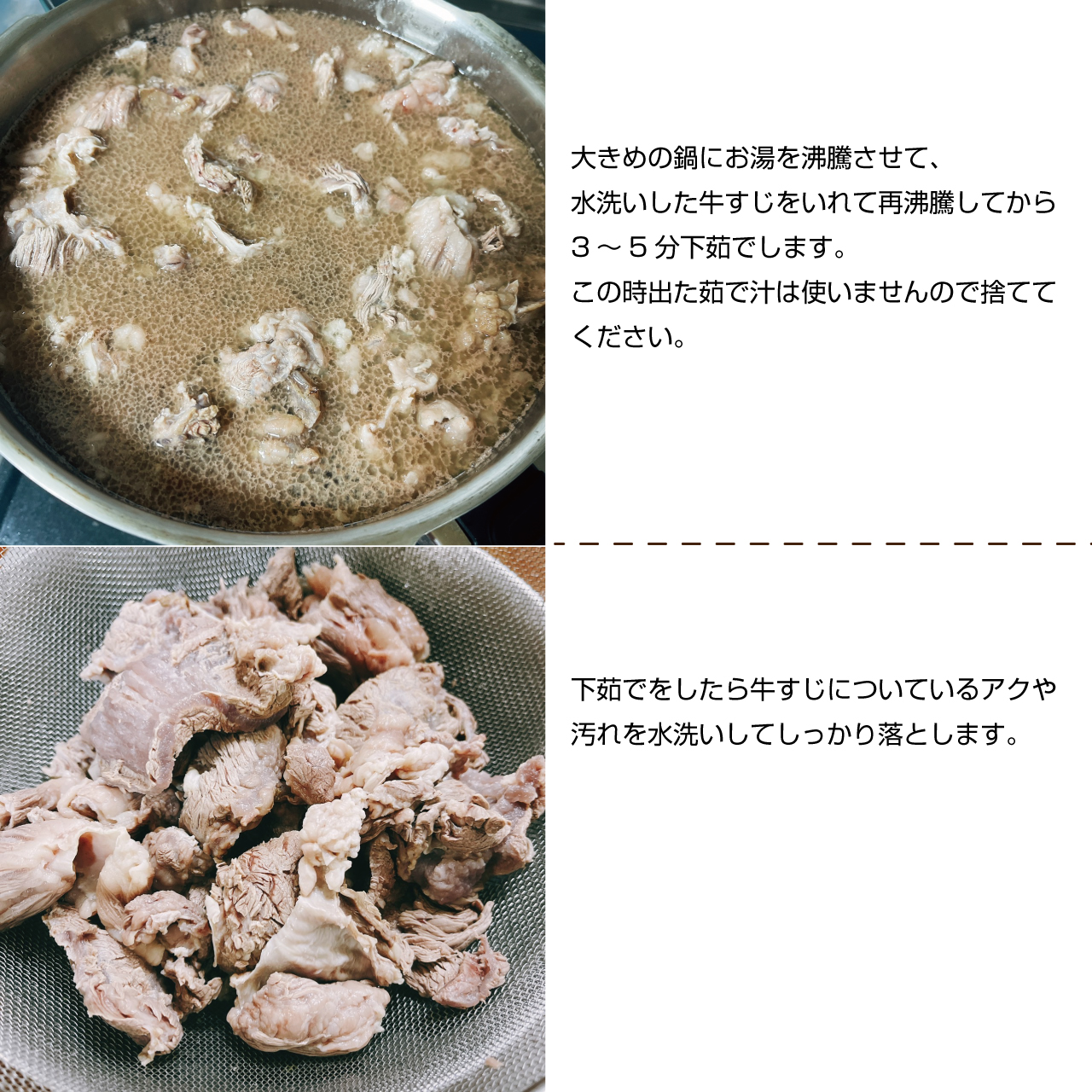③牛すじの下処理。牛すじを軽く水洗いし、血合い、汚れ、余分な脂を落とします。