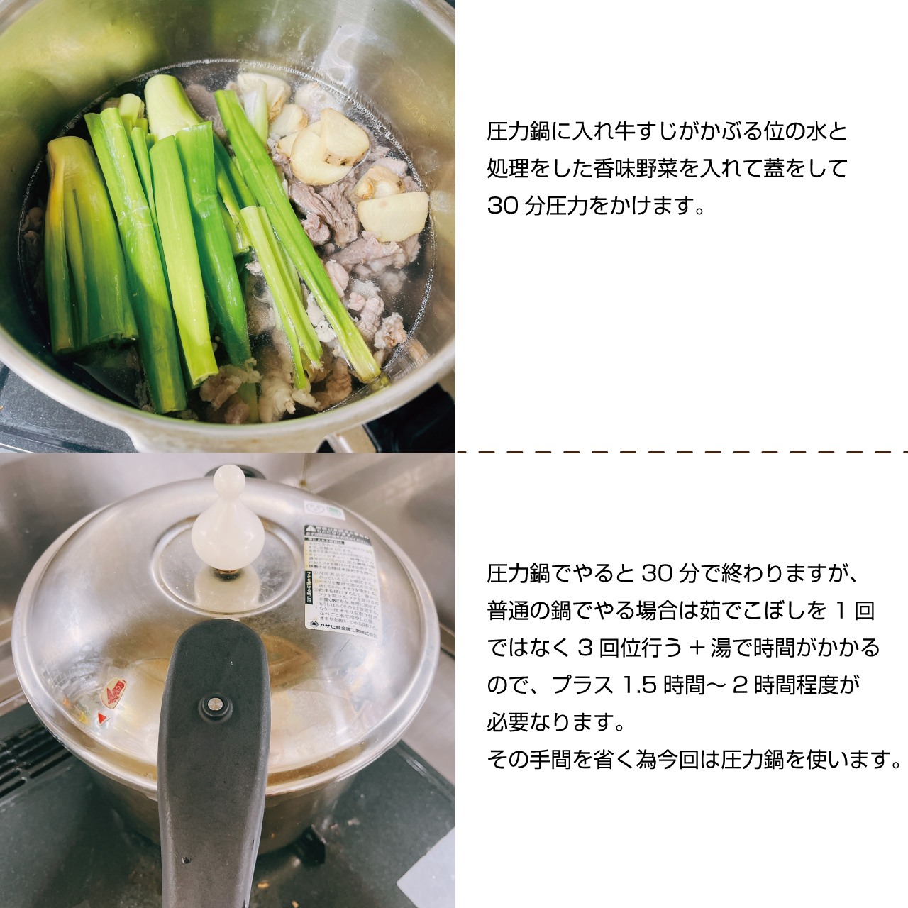 ③下茹でをしたら牛すじについているアクや汚れを水洗いしてしっかり落とし、圧力鍋に入れ牛すじがかぶる位の水と①の香味野菜を入れて蓋をして30分圧力をかけます。
