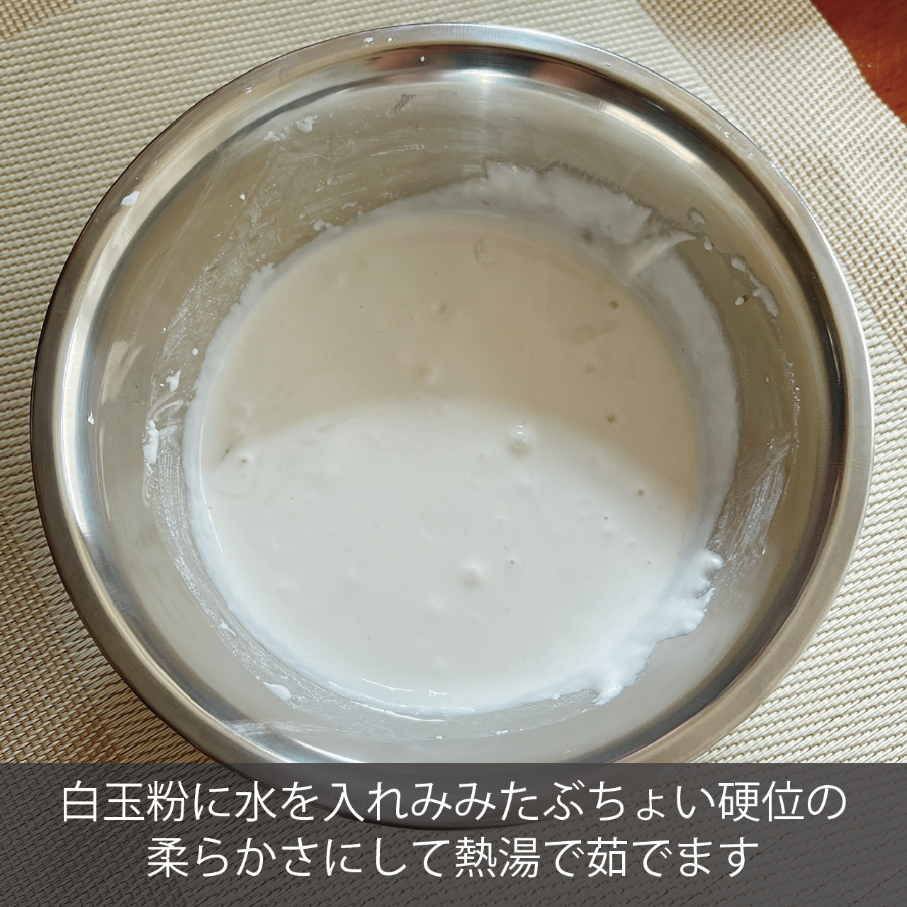 ・白玉粉は茹でる時に、手離れがよくすっと手から離れる位の粘度がちょうど良いです。ベチャベチャで手から離れない位だと水が多すぎです。大きいと食べづらいので小さめがおすすめ