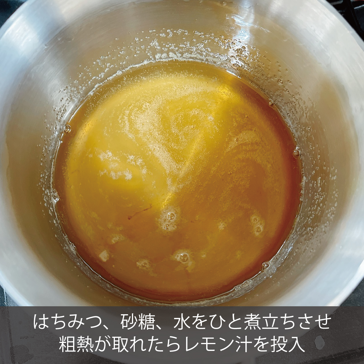 ❹レモン汁以外の■シロップの材料を鍋に入れひと煮立ちさせ火を止めます。粗熱を取りレモン汁を入れます。