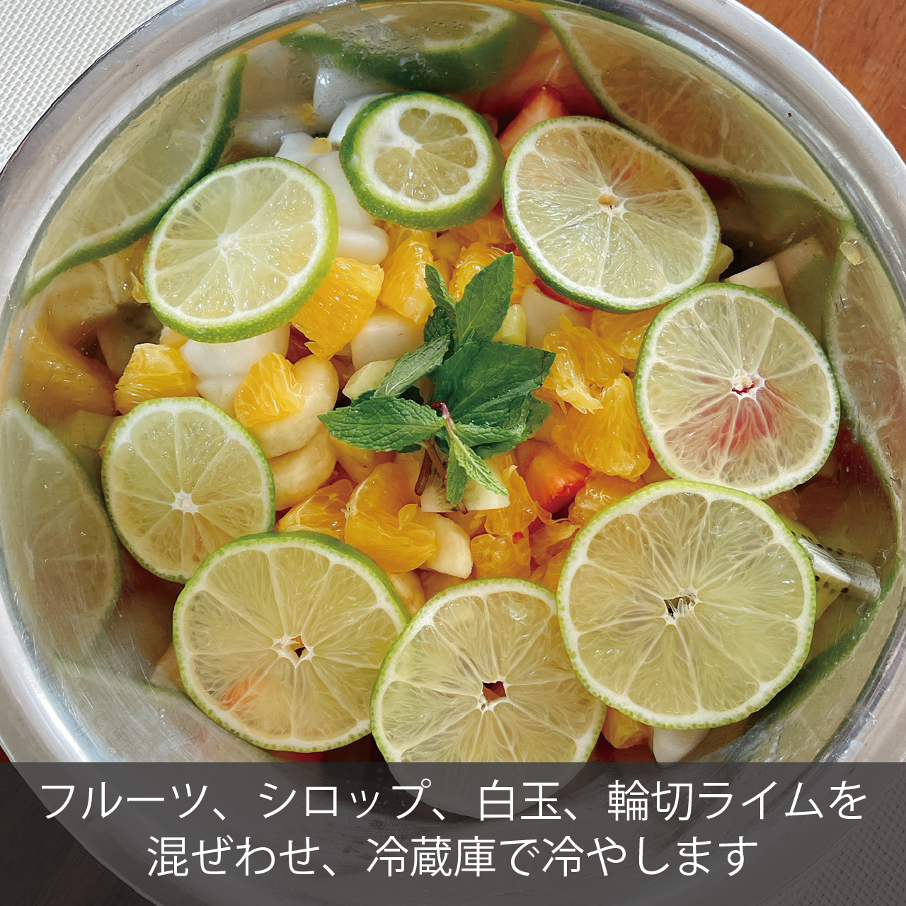 ❺粗熱の取れたシロップに、果物、白玉粉を入れ、輪切りにしたライムorレモンを入れて混ぜ、冷蔵庫で冷やします。
