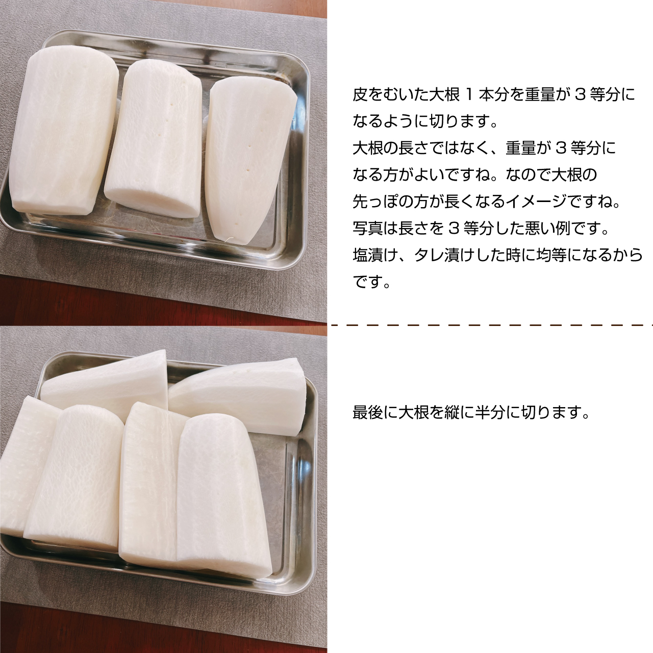 ①皮をむいた大根1本分を重量が3等分になるように切ります。大根の長さではなく、重量が3等分になる方がよいですね。なので大根の先っぽの方が長くなるイメージですね。塩漬け、タレ漬けした時に均一になるからです。最後に大根を縦に半分に切ります。