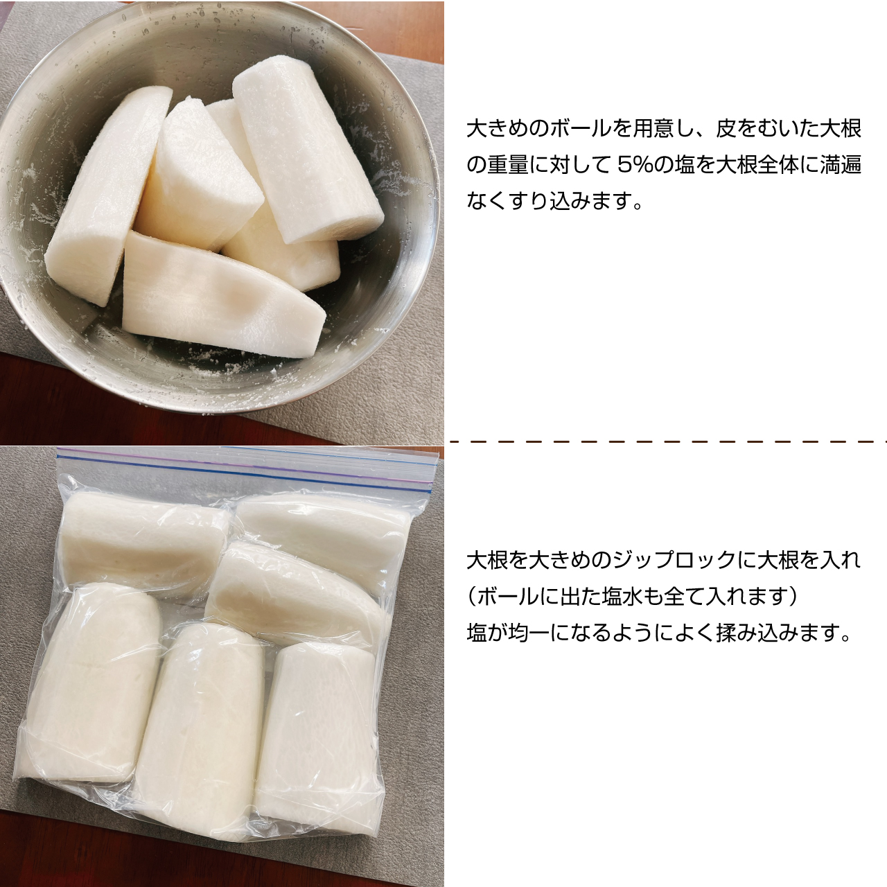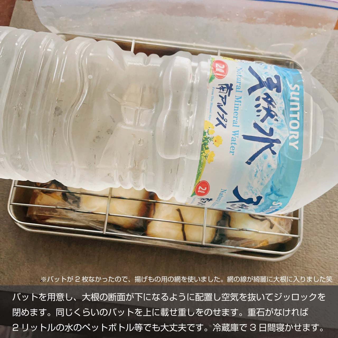 ③大根を大きめのジップロックに入れ(ボールに出た塩水も全て入れます)塩が均一になるようによく揉み込みます。バットを用意し、大根の切断面が下になるように配置し空気を抜いてジッロックを閉めます。同じくらいのバットを上に載せ重しをのせます。重しがなければ2リットルの水のペットボトル等でも大丈夫です。冷蔵庫に入れて3日間寝かせます。