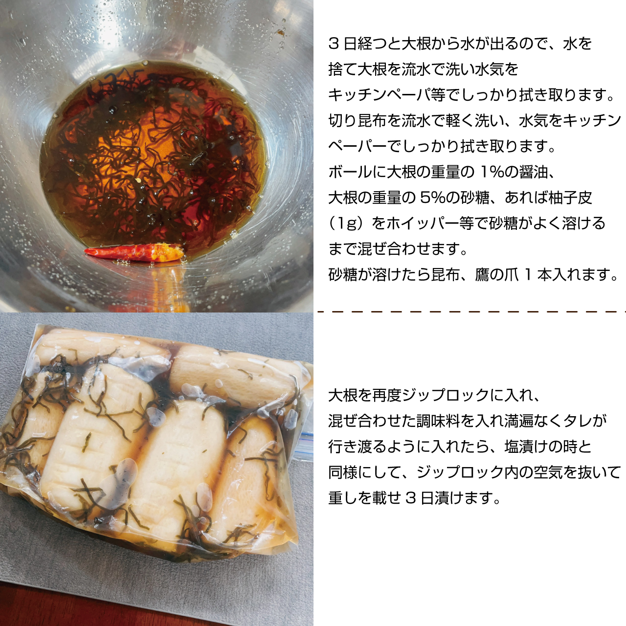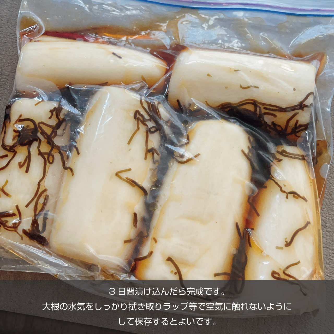 ⑥3日間漬け込んだら完成です。大根の水気をしっかり拭き取りラップ等で空気に触れないようにして保存するとよいです。