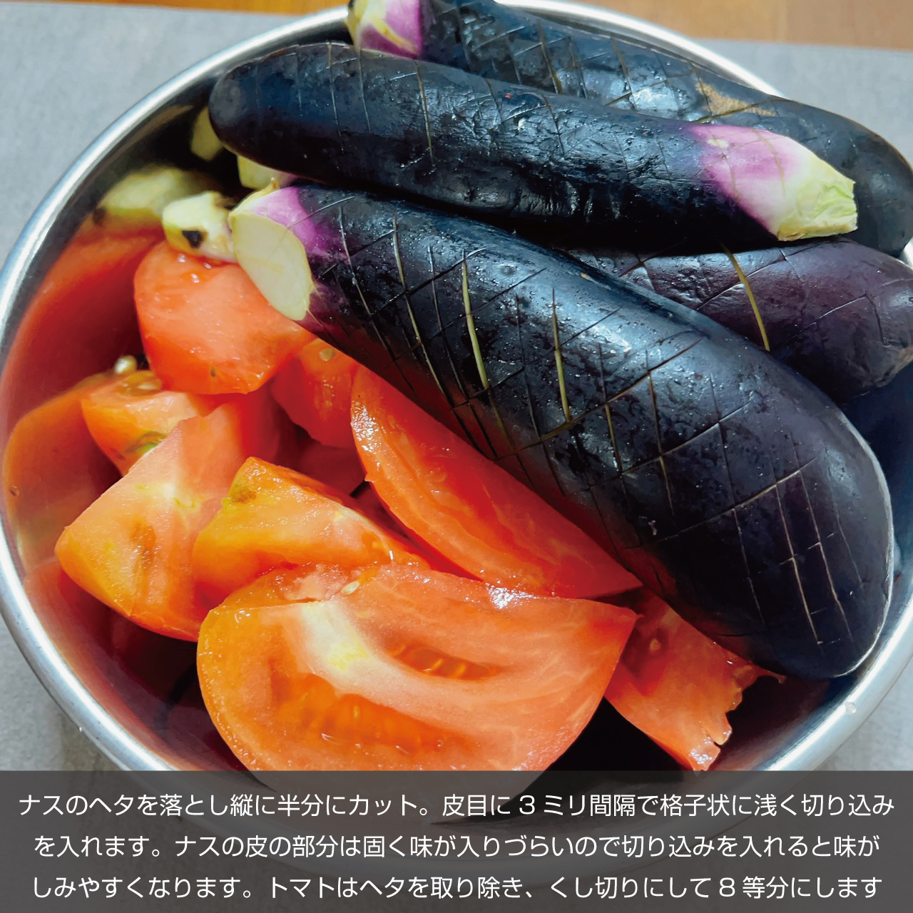 ①ナスのヘタを落とし、縦に半分にカットし、皮目に3ミリ間隔で格子状に浅く切り込みを入れます。