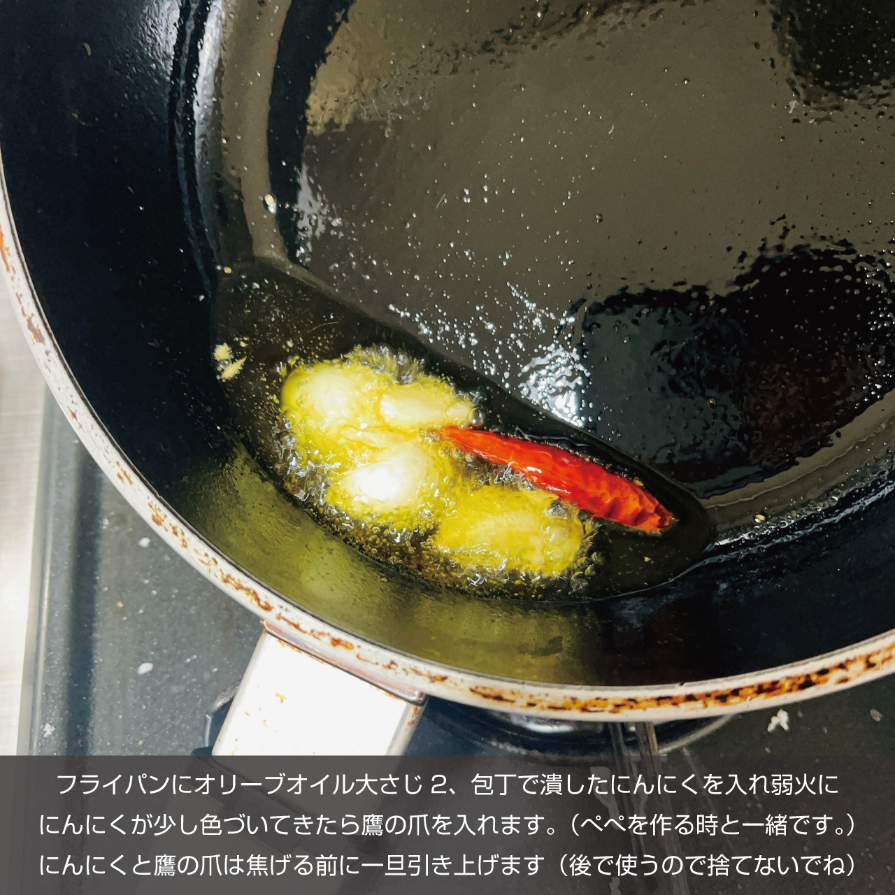 ③フライパンにオリーブオイル大さじ2、包丁で潰したにんにくを入れ弱火にかけます。にんにくが少し色づいてきたら鷹の爪を入れて香りをオイルにうつしていきます。(ぺぺを作る時のにんにくオイル作りと一緒です。)にんにくと鷹の爪は焦げる前に一旦引き上げます(後で戻し入れるのでとっておいてください。)