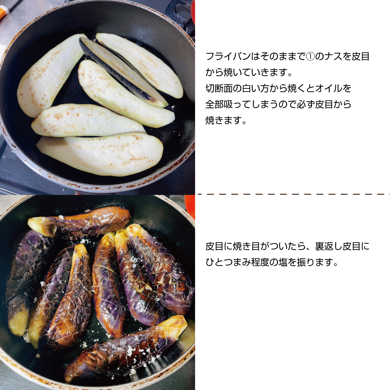 ②ナスに焼色をつける時は皮目から焼く